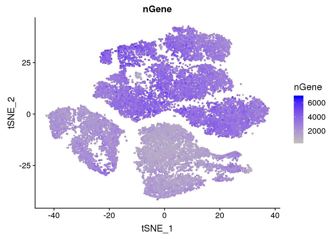 FeaturePlot(seurobj, reduction.use='tsne', features.plot = 'nGene', cols.use=c('grey', 'blue'), no.legend = F)