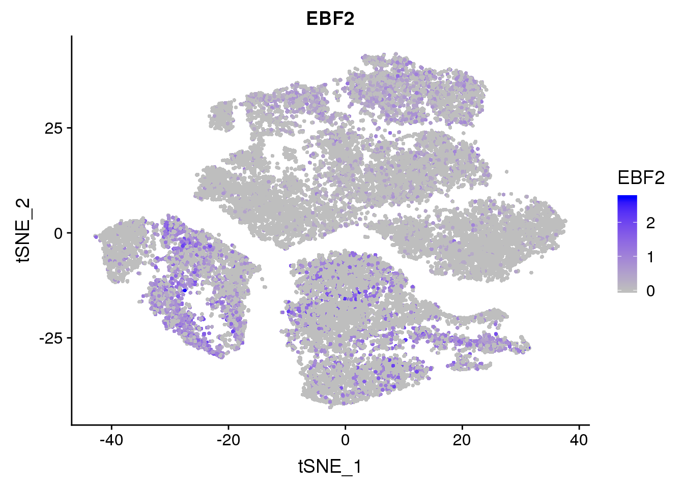 FeaturePlot(seurobj, reduction.use='tsne', features.plot = 'EBF2', cols.use=c('grey', 'blue'), no.legend = F)