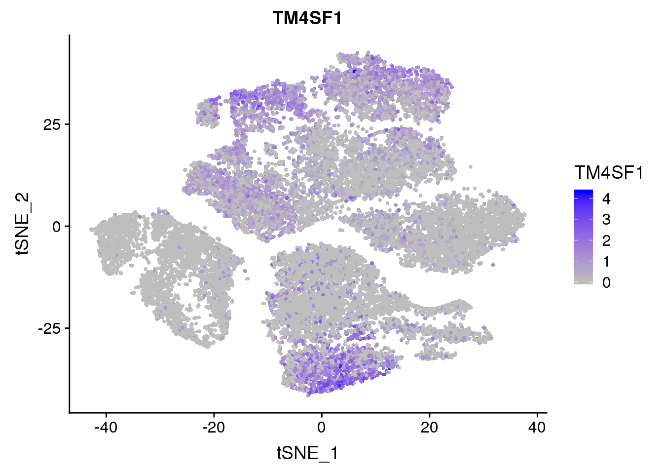FeaturePlot(seurobj, reduction.use='tsne', features.plot = 'TM4SF1', cols.use=c('grey', 'blue'), no.legend = F)