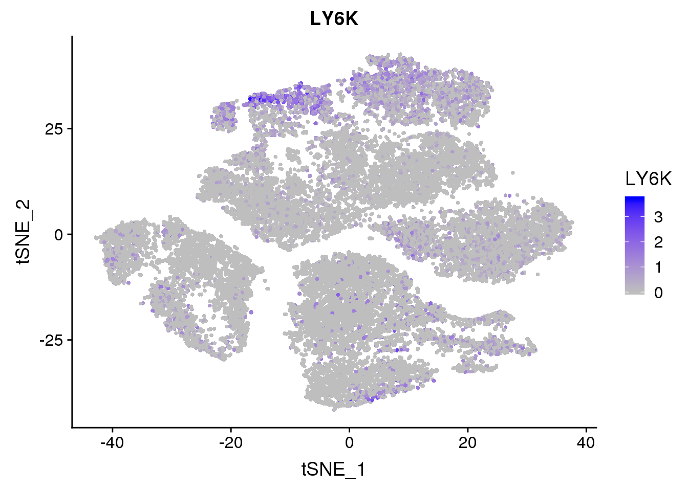 FeaturePlot(seurobj, reduction.use='tsne', features.plot = 'LY6K', cols.use=c('grey', 'blue'), no.legend = F)