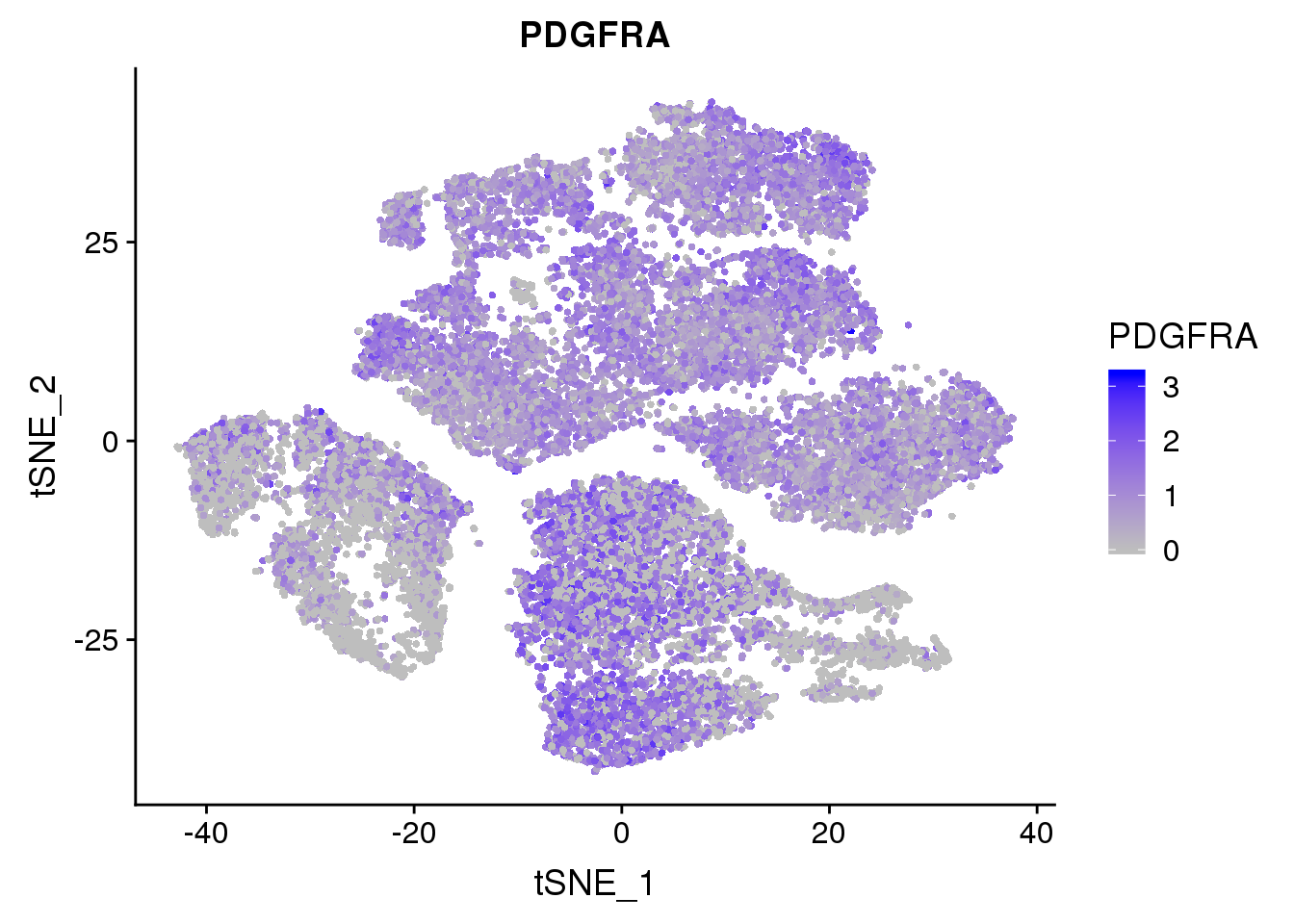 FeaturePlot(seurobj, reduction.use='tsne', features.plot = 'PDGFRA', cols.use=c('grey', 'blue'), no.legend = F)