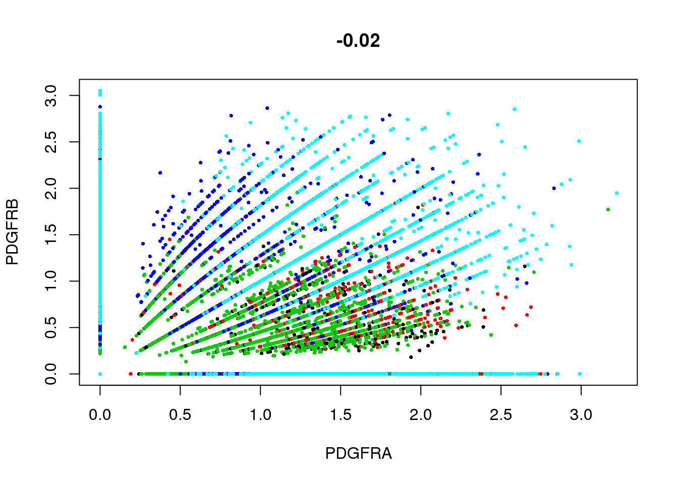 GenePlot(SetAllIdent(seurobj, id='timepoint'), gene1='PDGFRA', gene2='PDGFRB', cex.use=0.5)