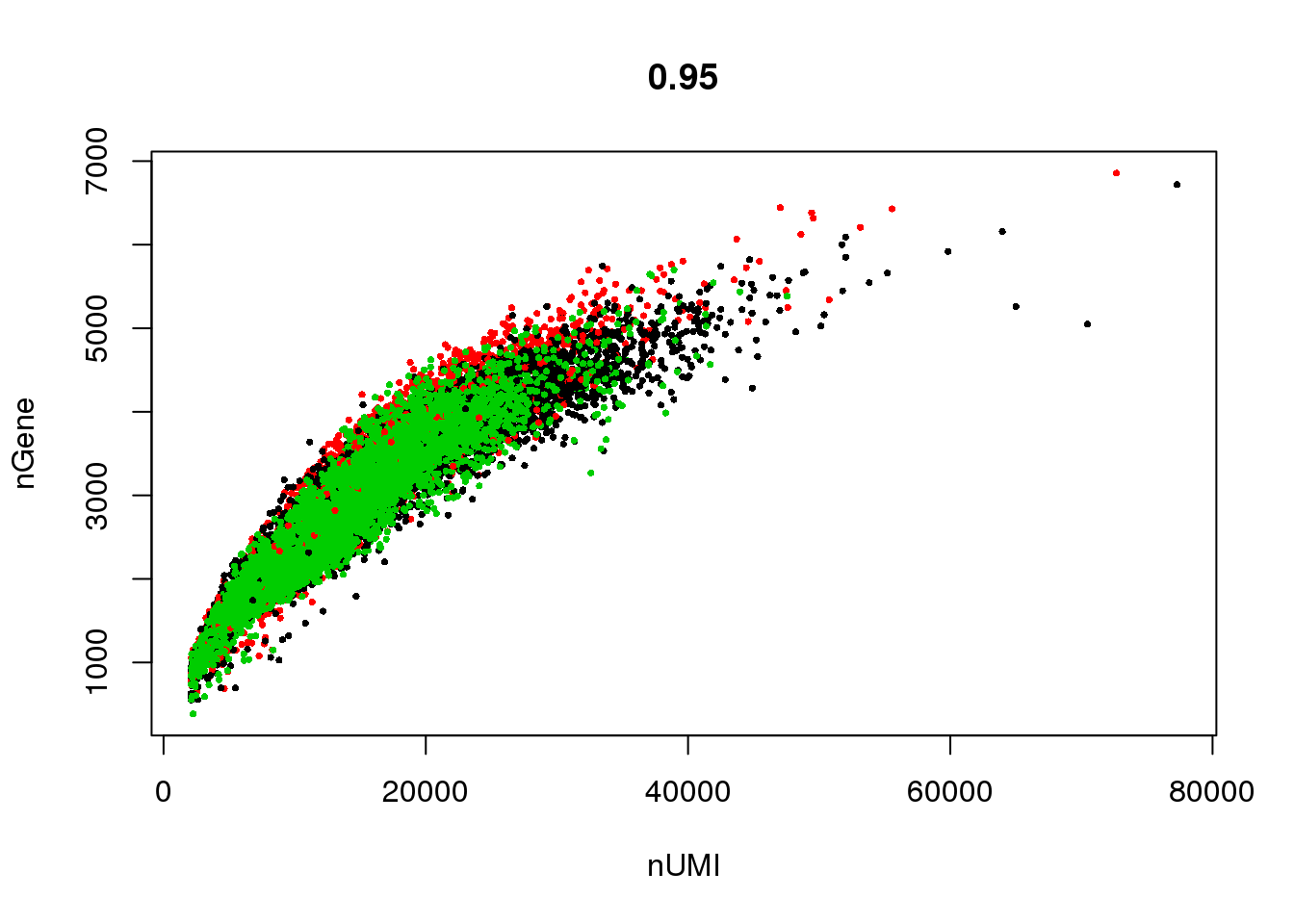 GenePlot(seurobj, 'nUMI', 'nGene', cex.use = 0.5)