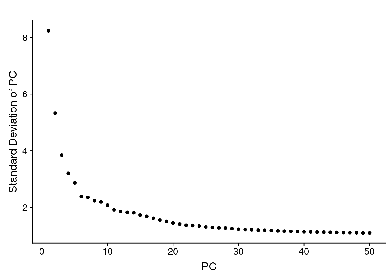 PCElbowPlot(seurobj, num.pc=50) #TSNE+clustering run on 21 PC's.