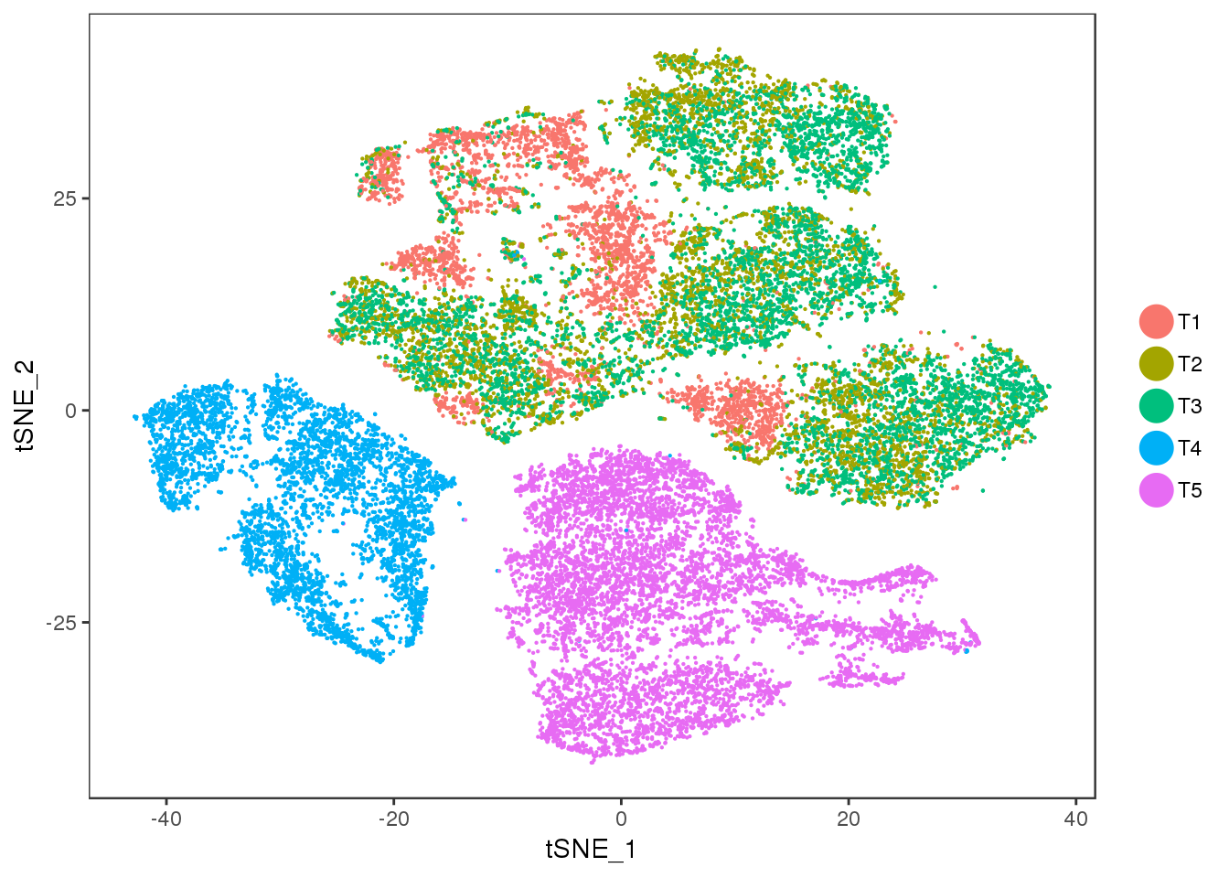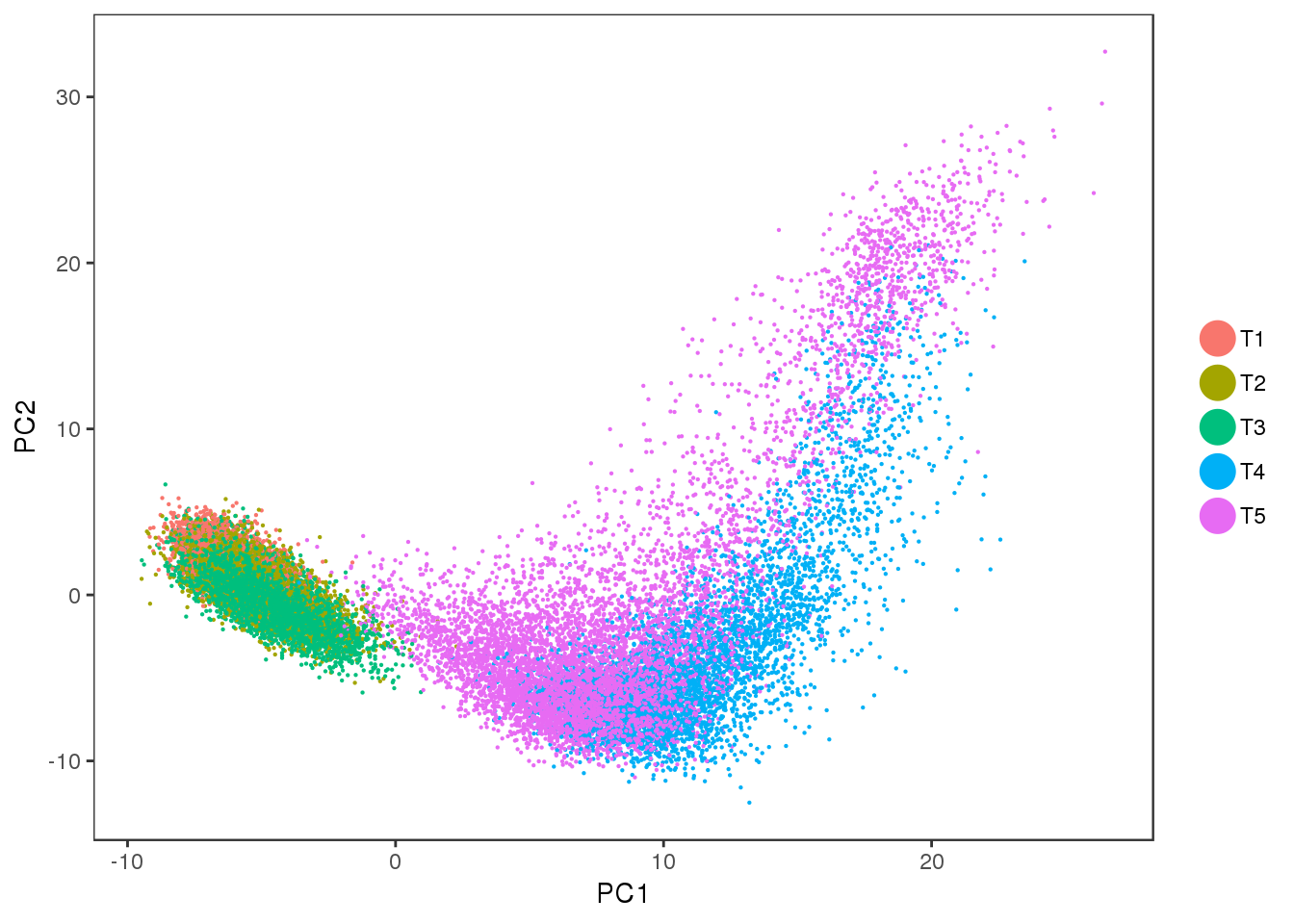 Interesting to see: T4 and T5 contain a lot more variation than T1, T2 and T3, and PC2 seems to split T4 and T5. Could the split in PC2 describe the cells developing into white or brown?