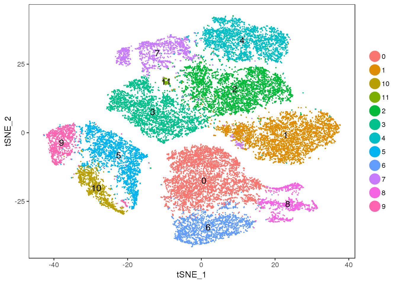 TSNEPlot(seurobj, group.by='res.0.5', pt.size=0.1, do.label=T)