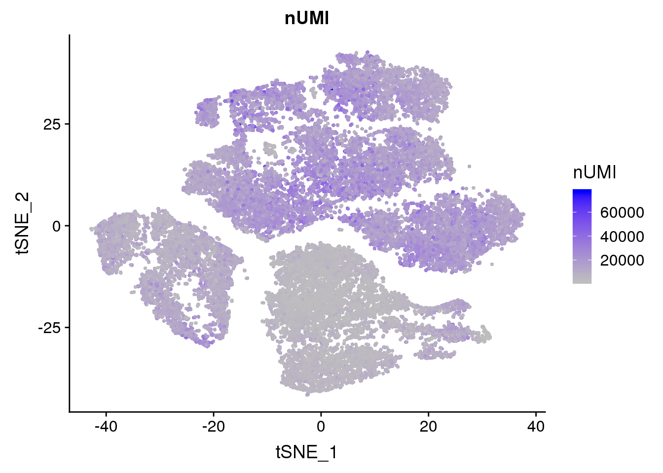 FeaturePlot(seurobj, reduction.use='tsne', features.plot = 'nUMI', cols.use=c('grey', 'blue'), no.legend=F)
