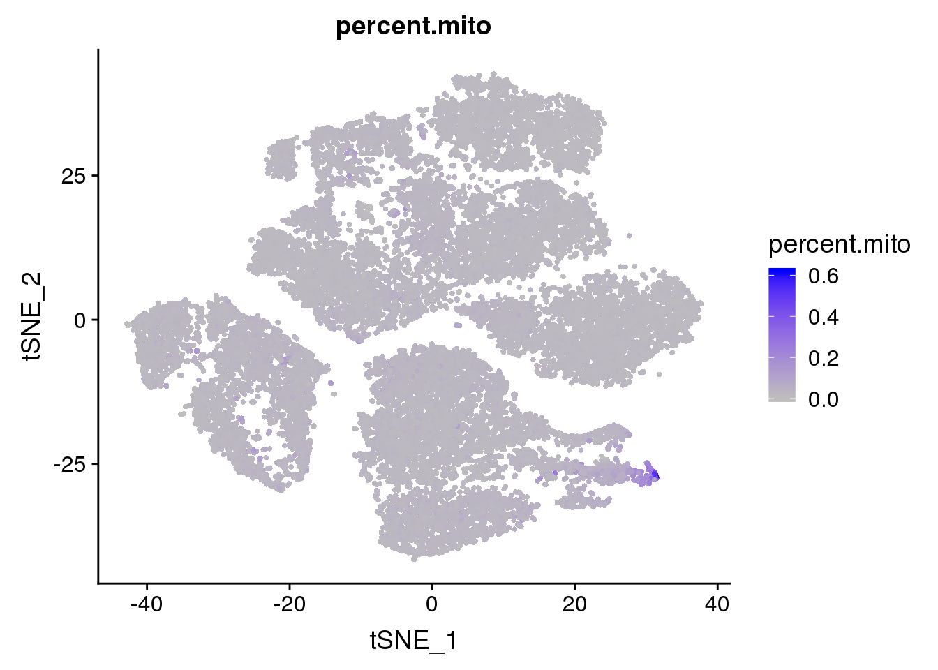 FeaturePlot(seurobj, features.plot = 'percent.mito', cols.use=c('grey', 'blue'), no.legend = F)