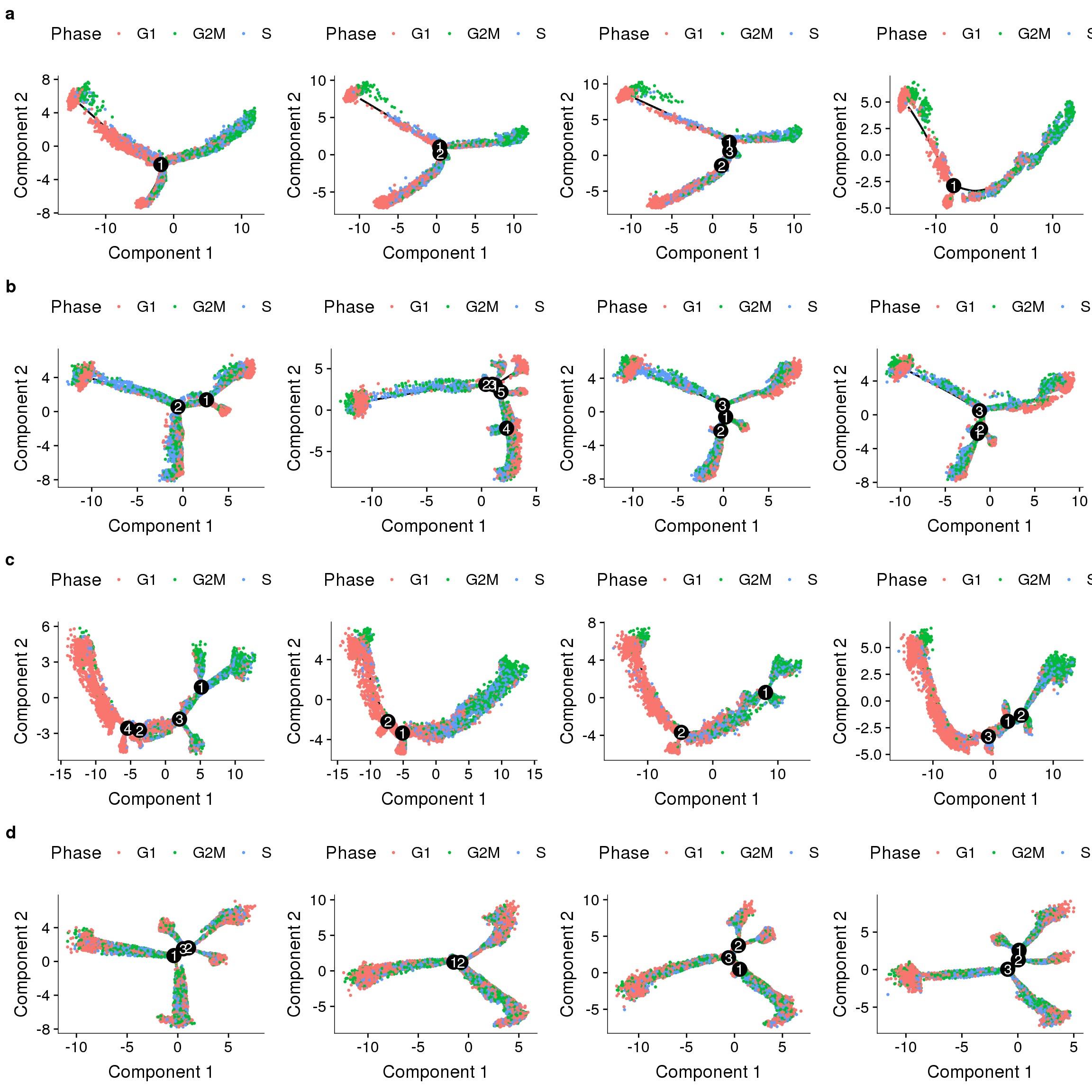 Trajectories of the 4 subsets with no variables regressed out. The ordering of the cells seems to be influenced by the cell cycle state (though not completely). Interestingly in three of the trajectories there is a branch split.