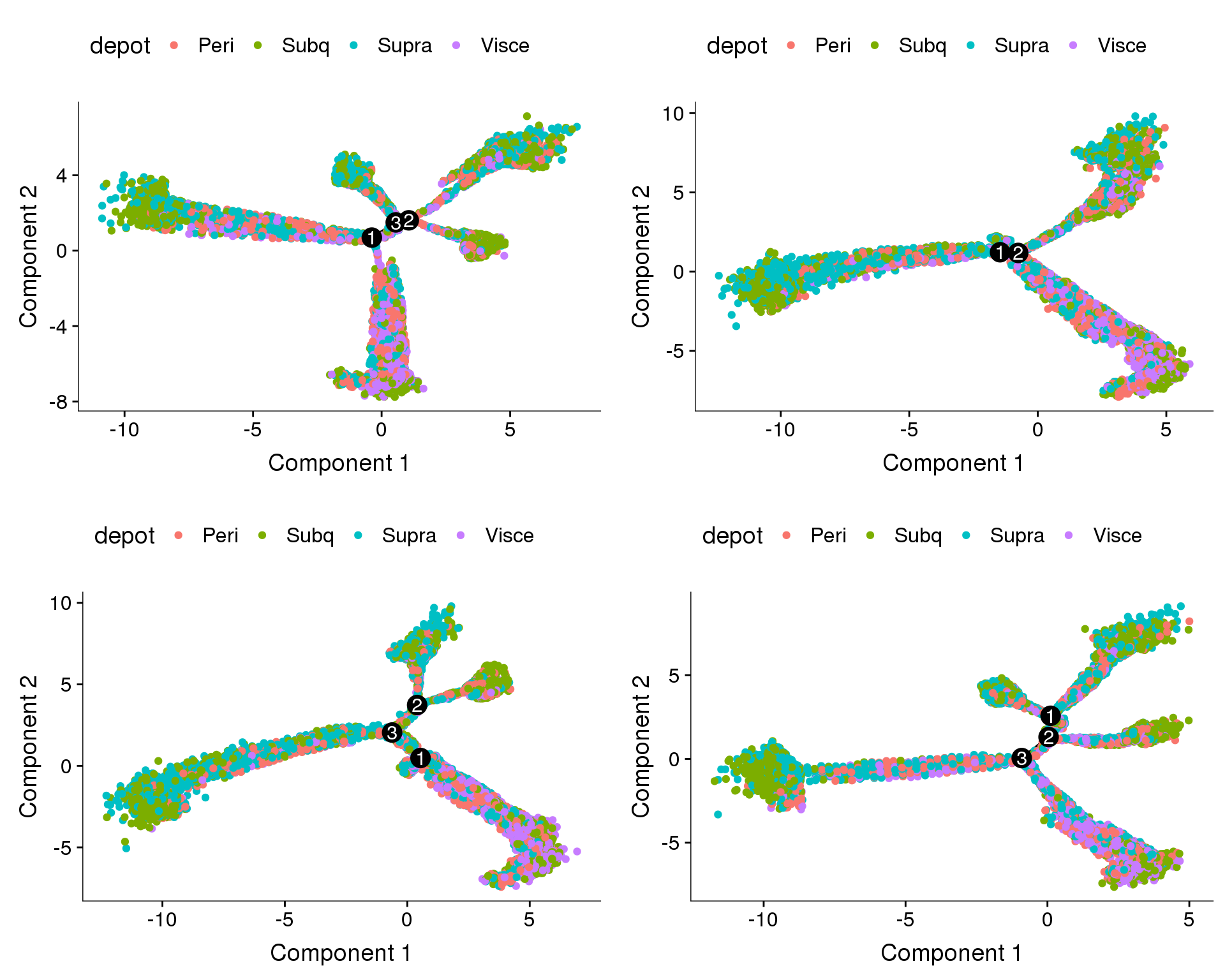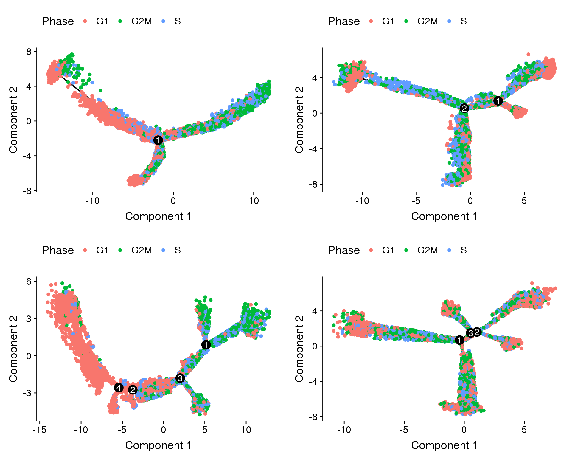 Trajectories of the 4 subsets with cell cycle effects regressed out. Topleft, bottom left and bottom right look similar but all have different number of branching points.