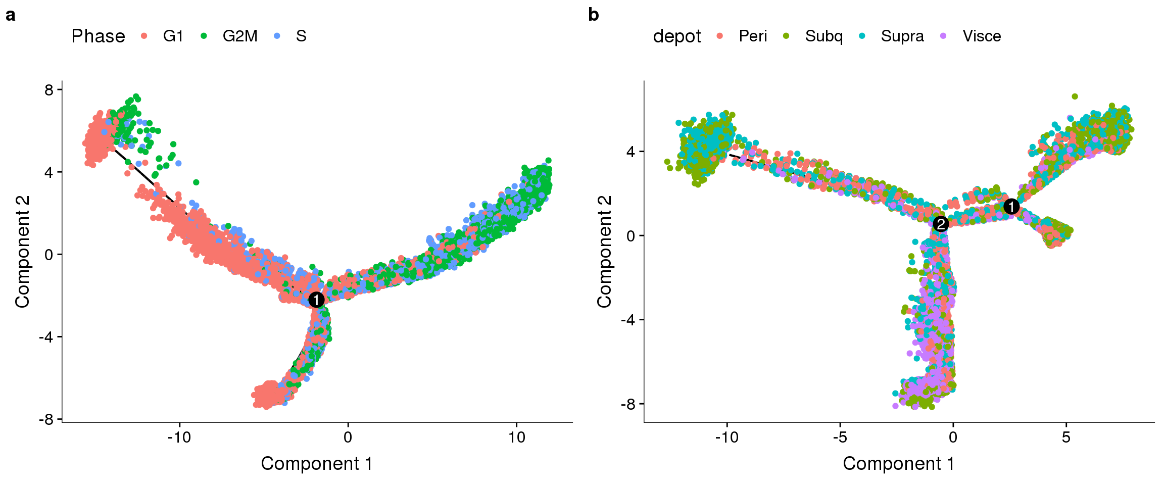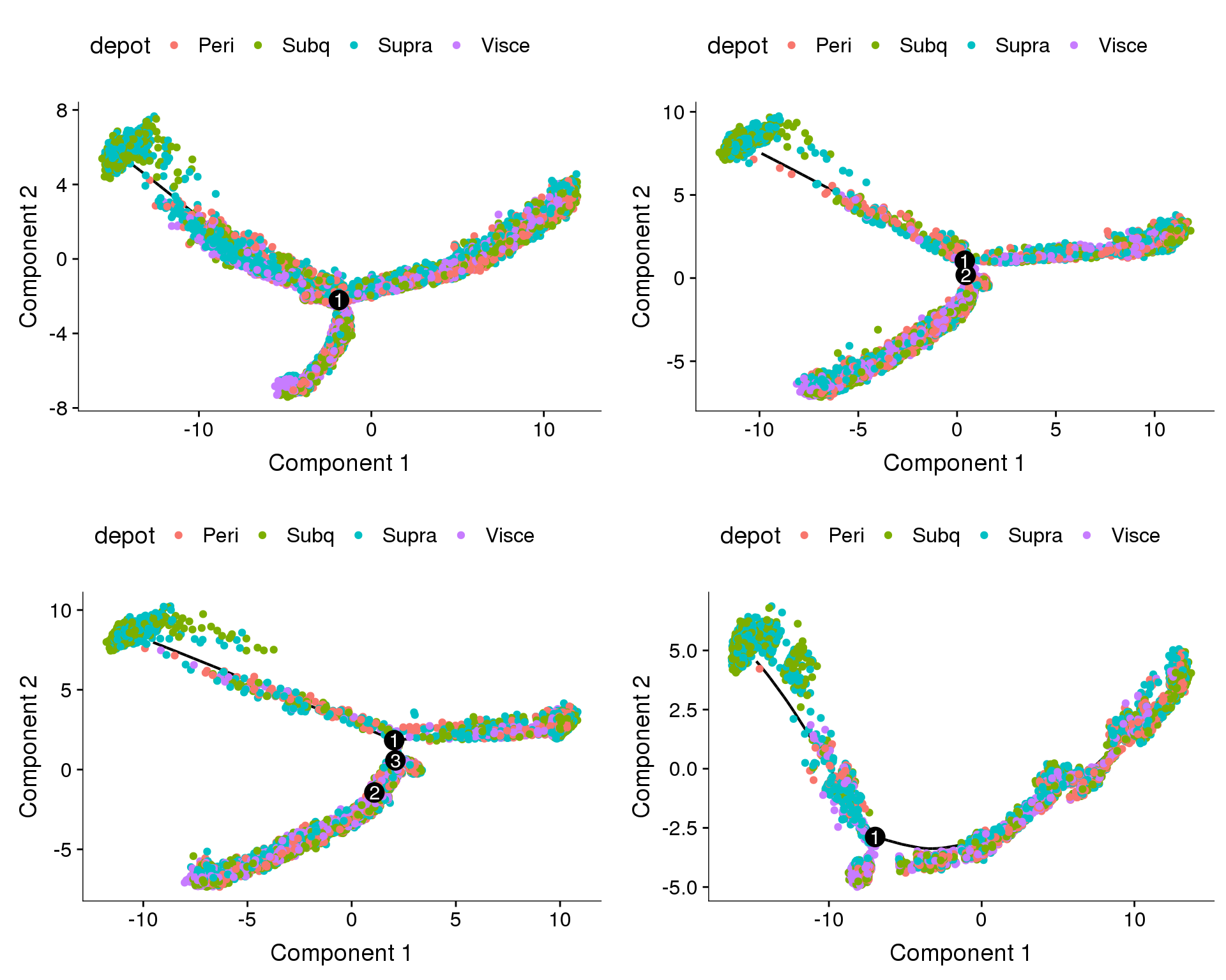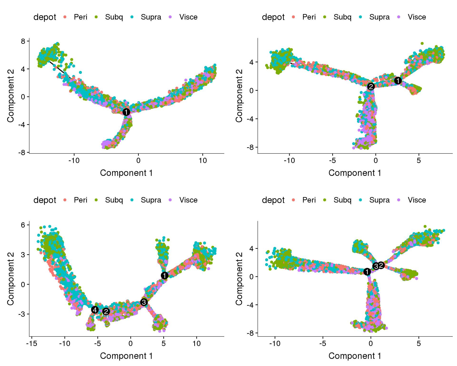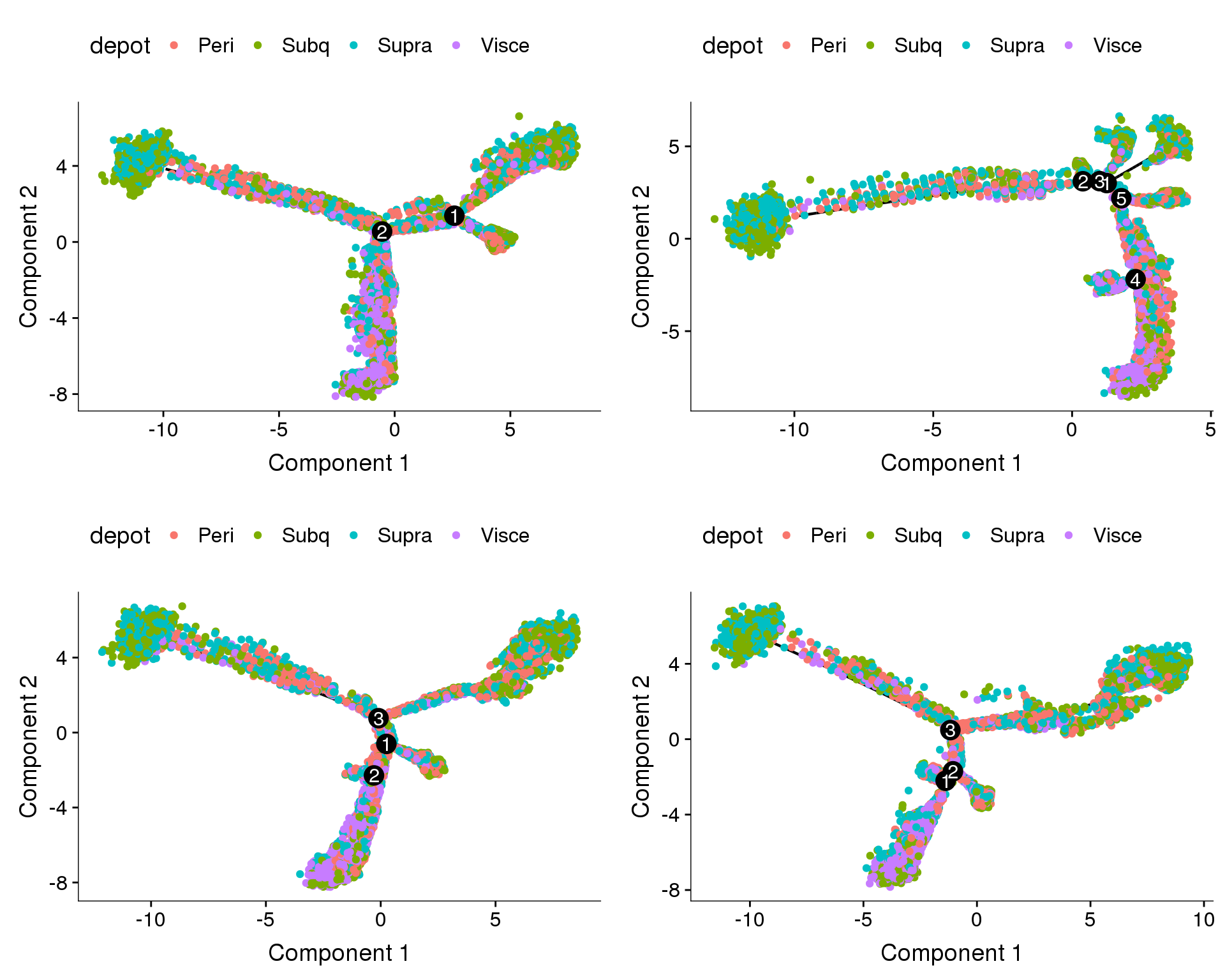 • Differences between depots or fat type were not captured by Monocle. The preadipocytes are at this timepoint likely very similar too each other.