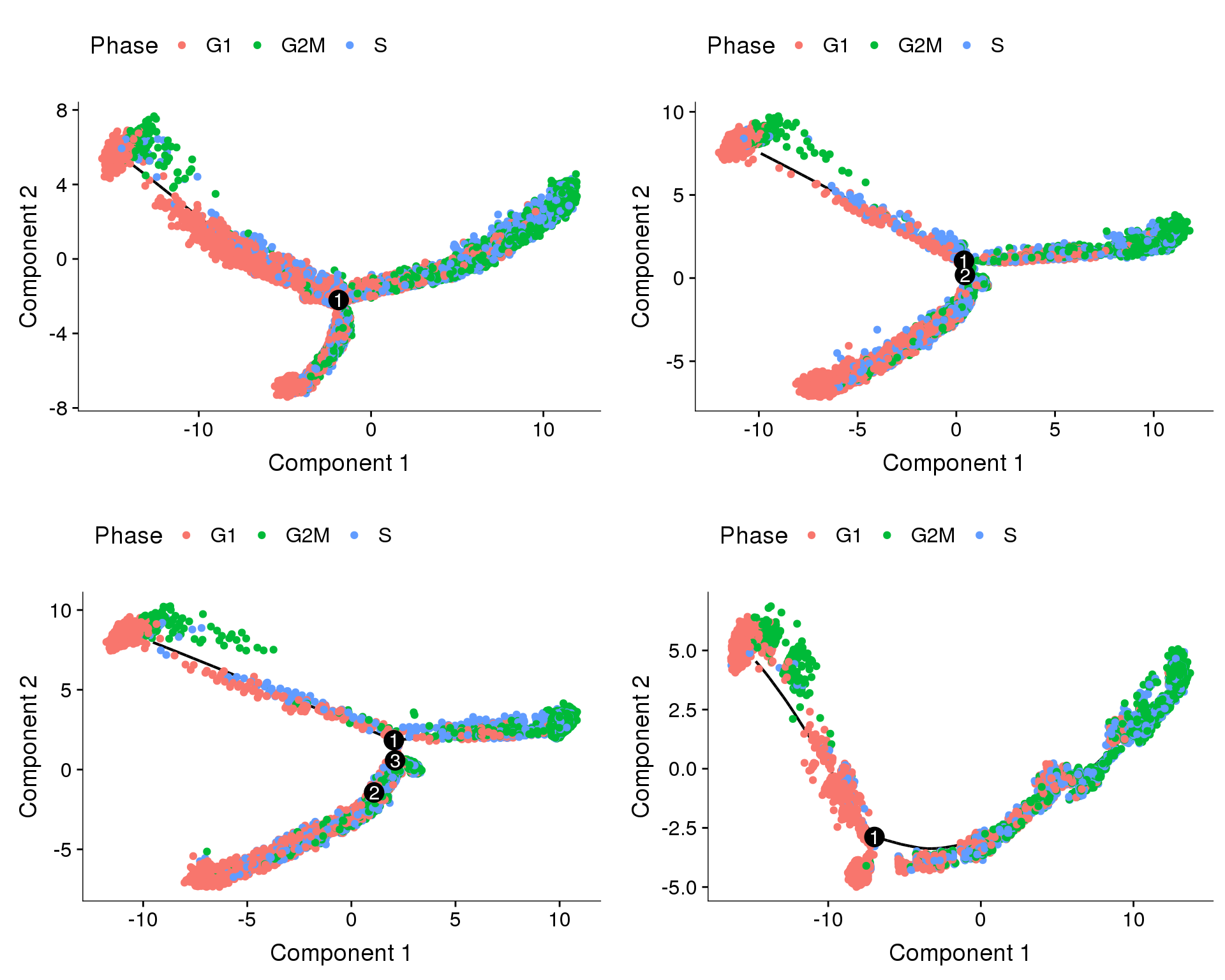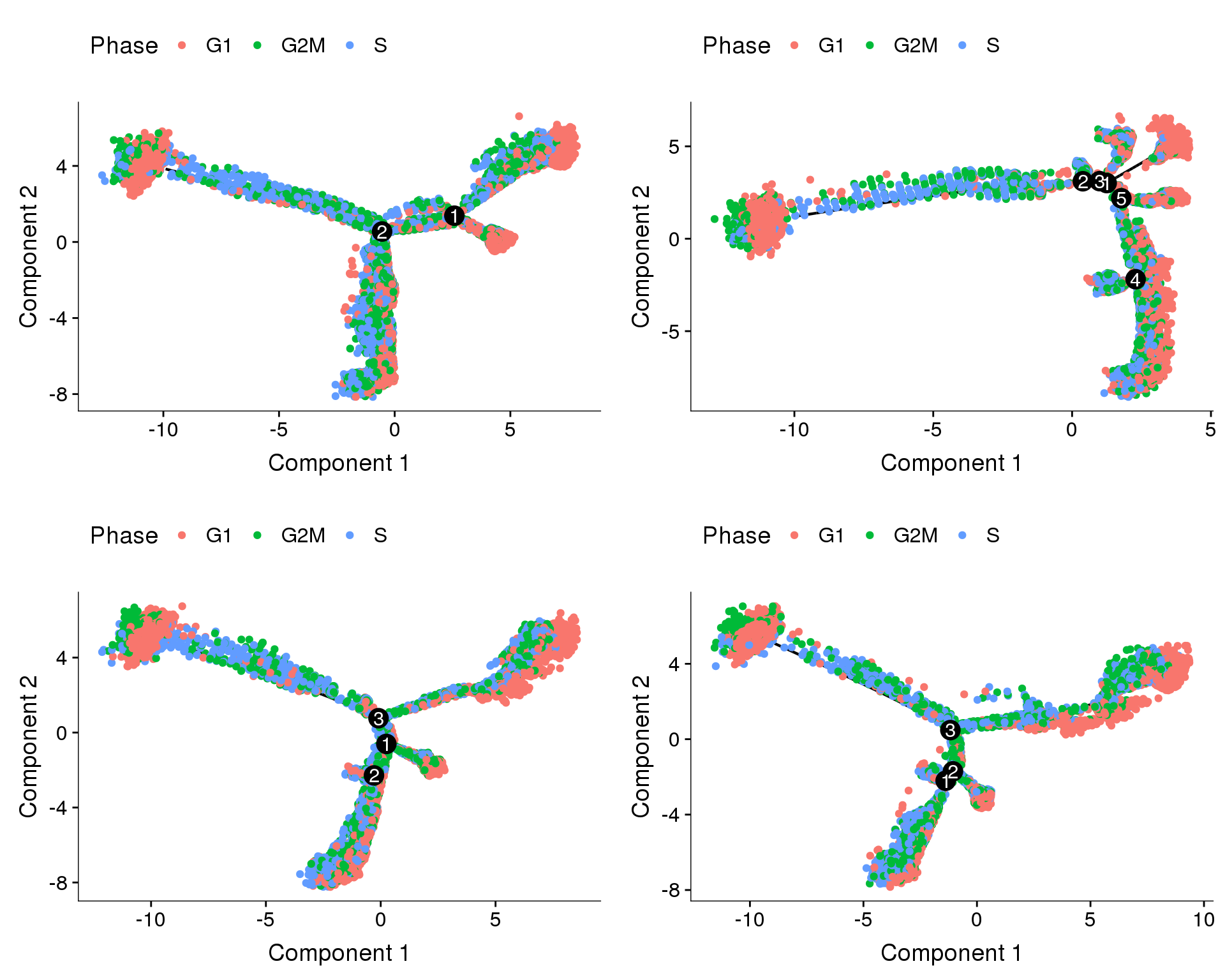 Trajectories of the 4 subsets with cell cycle effects regressed out. Topleft, bottom left and bottom right look similar but all have different number of branching points.