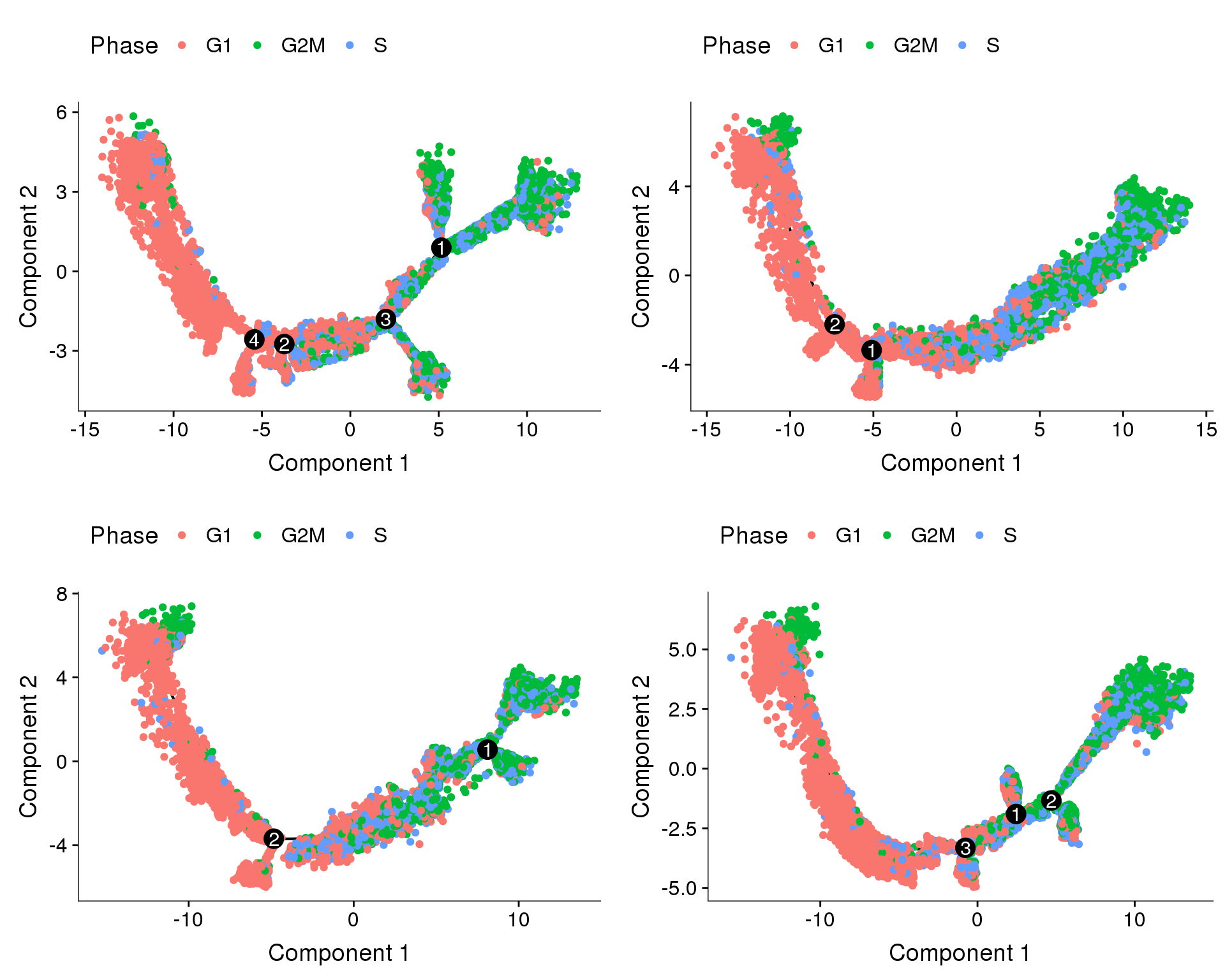 Trajectories of the 4 subsets with no variables regressed out. The ordering of the cells seems to be influenced by the cell cycle state (though not completely). Interestingly in three of the trajectories there is a branch split.