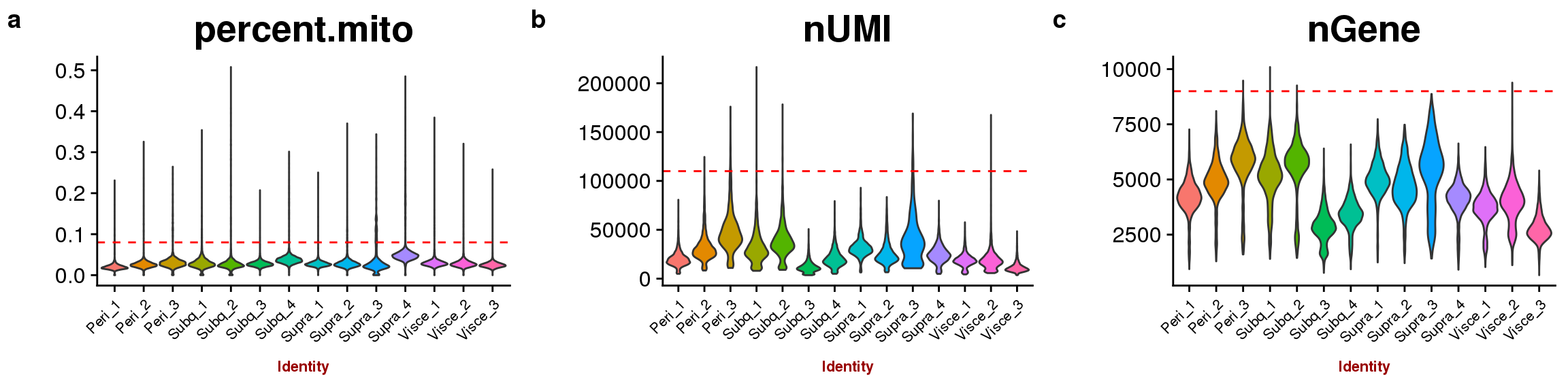 numi <- VlnPlot(all10x.beforeqc, features.plot='nUMI', group.by='sample_name', point.size.use = -1, do.return=T, x.lab.rot=T, size.x.use=8) + geom_hline(yintercept=110000, linetype="dashed", color = "red")
