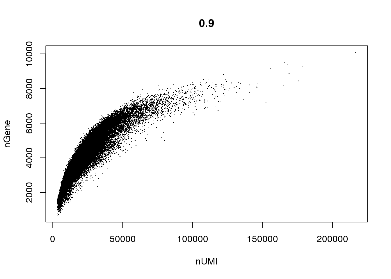 GenePlot(all10x.beforeqc, 'nUMI', 'nGene', cex.use = 0.2, do.return=T)