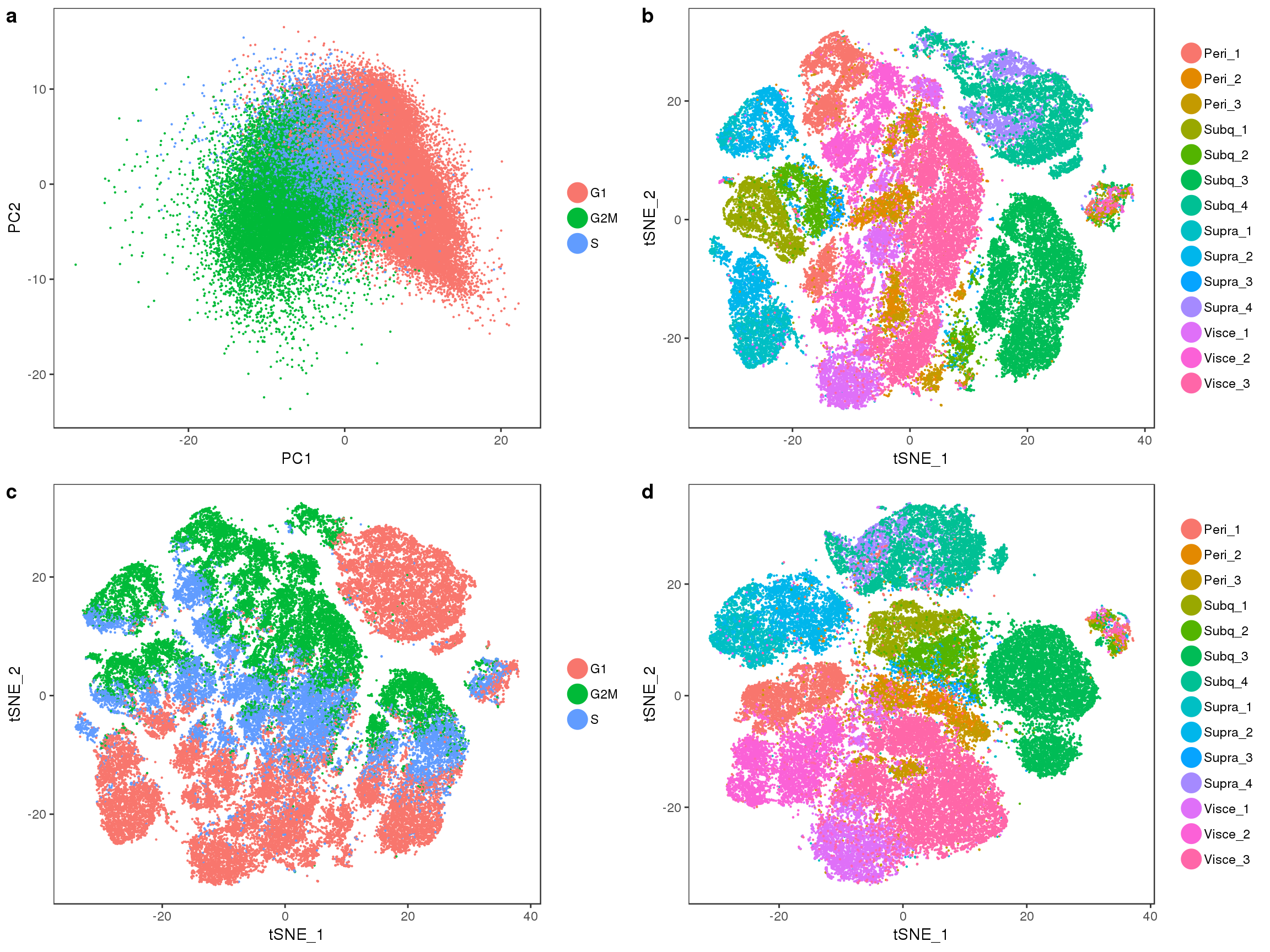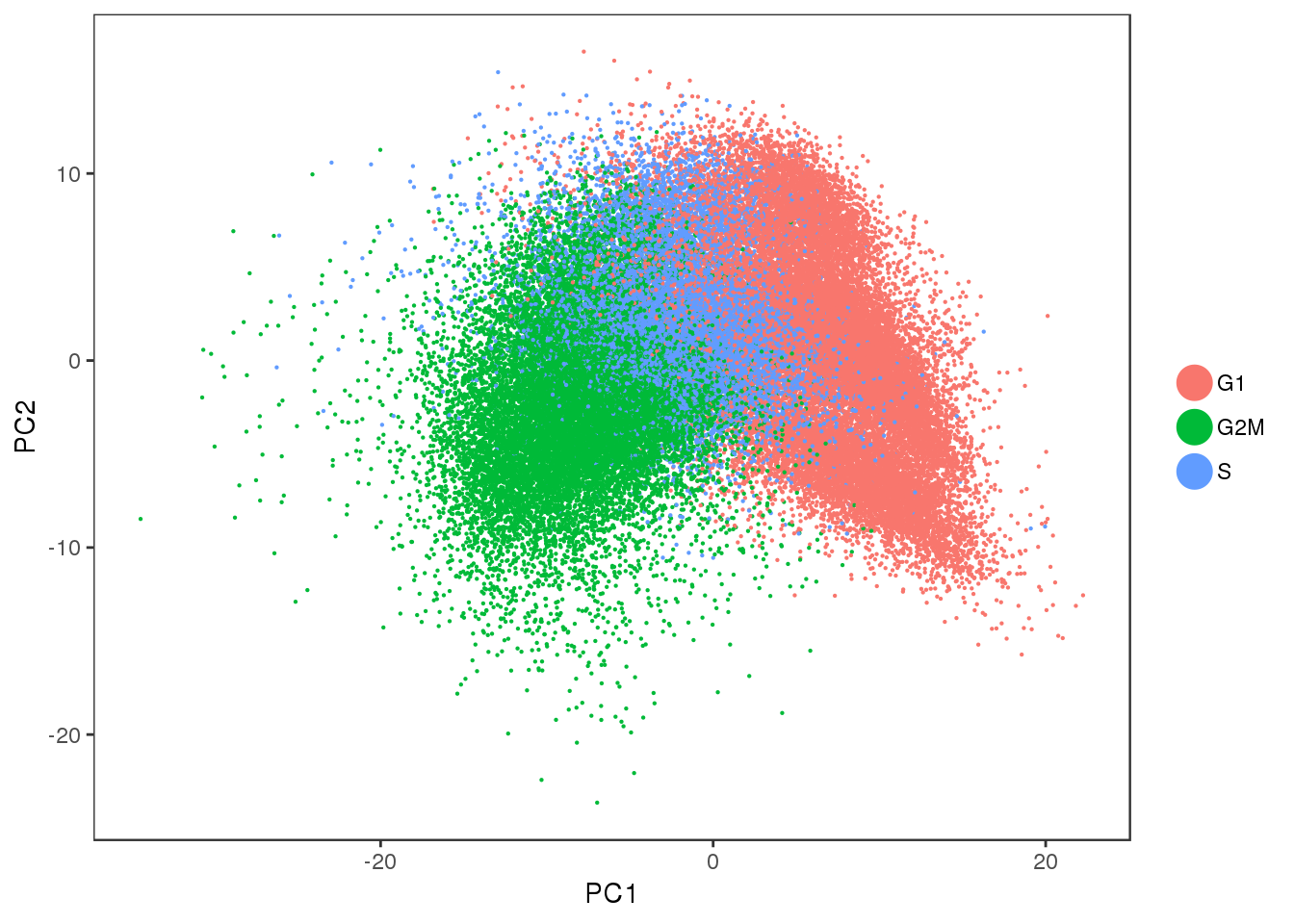 PCA plot of the cell cycle regressed out data. There is no cell cycle effect anymore.
