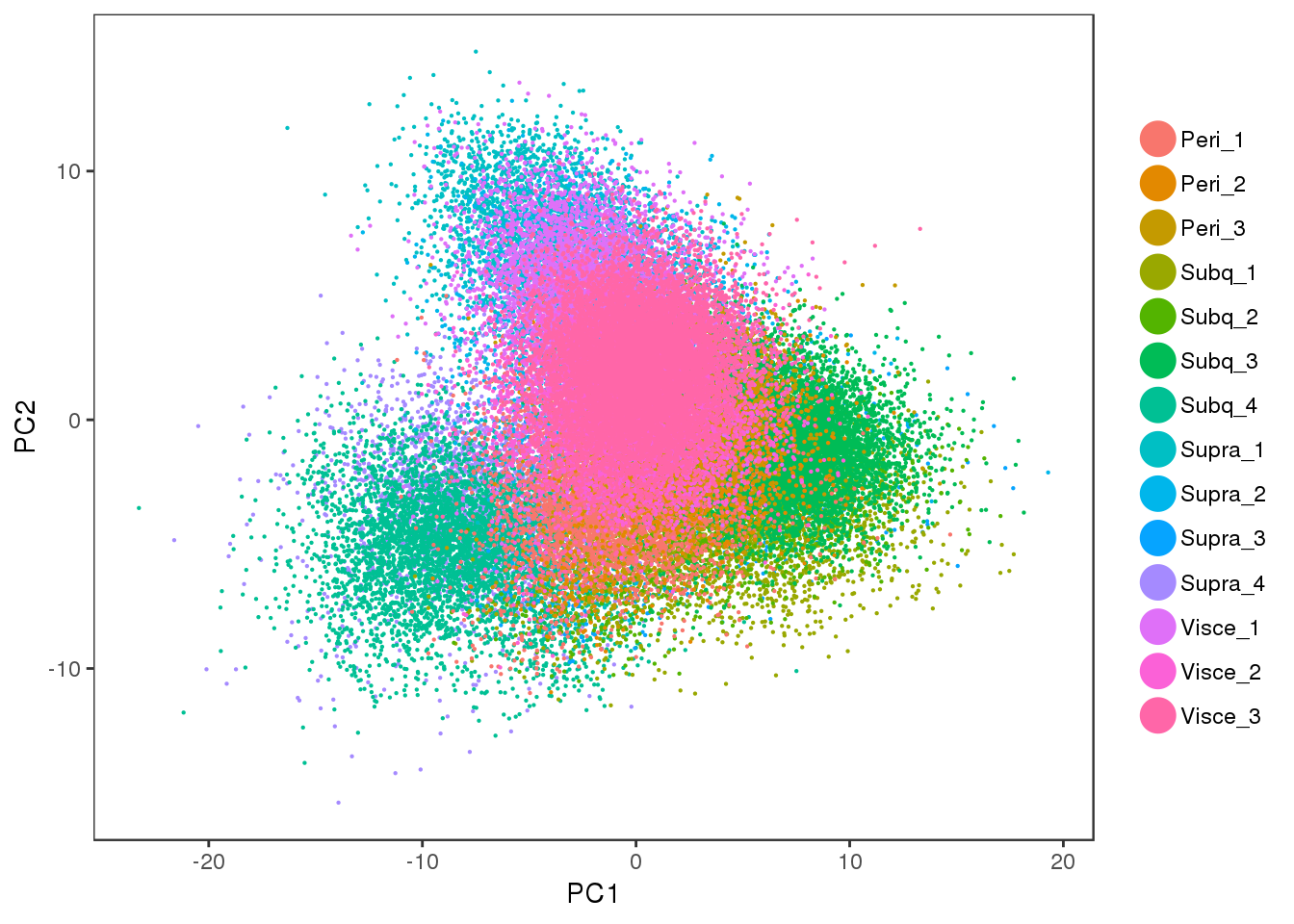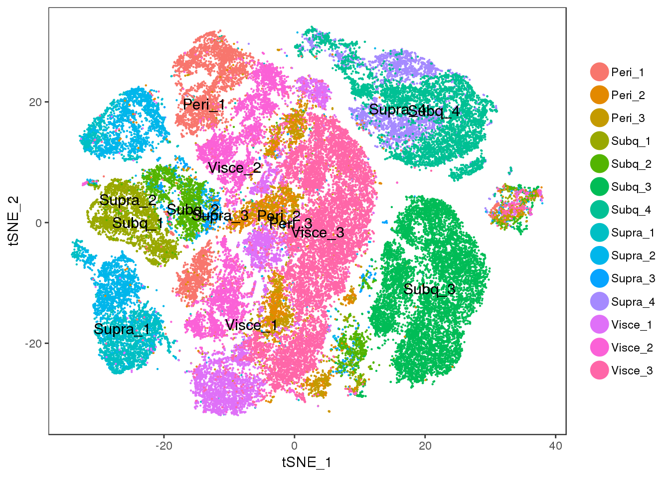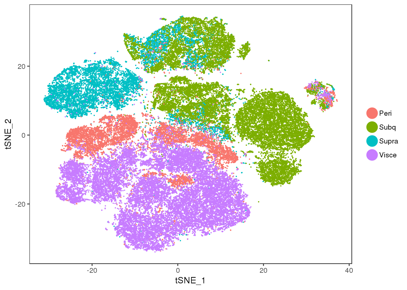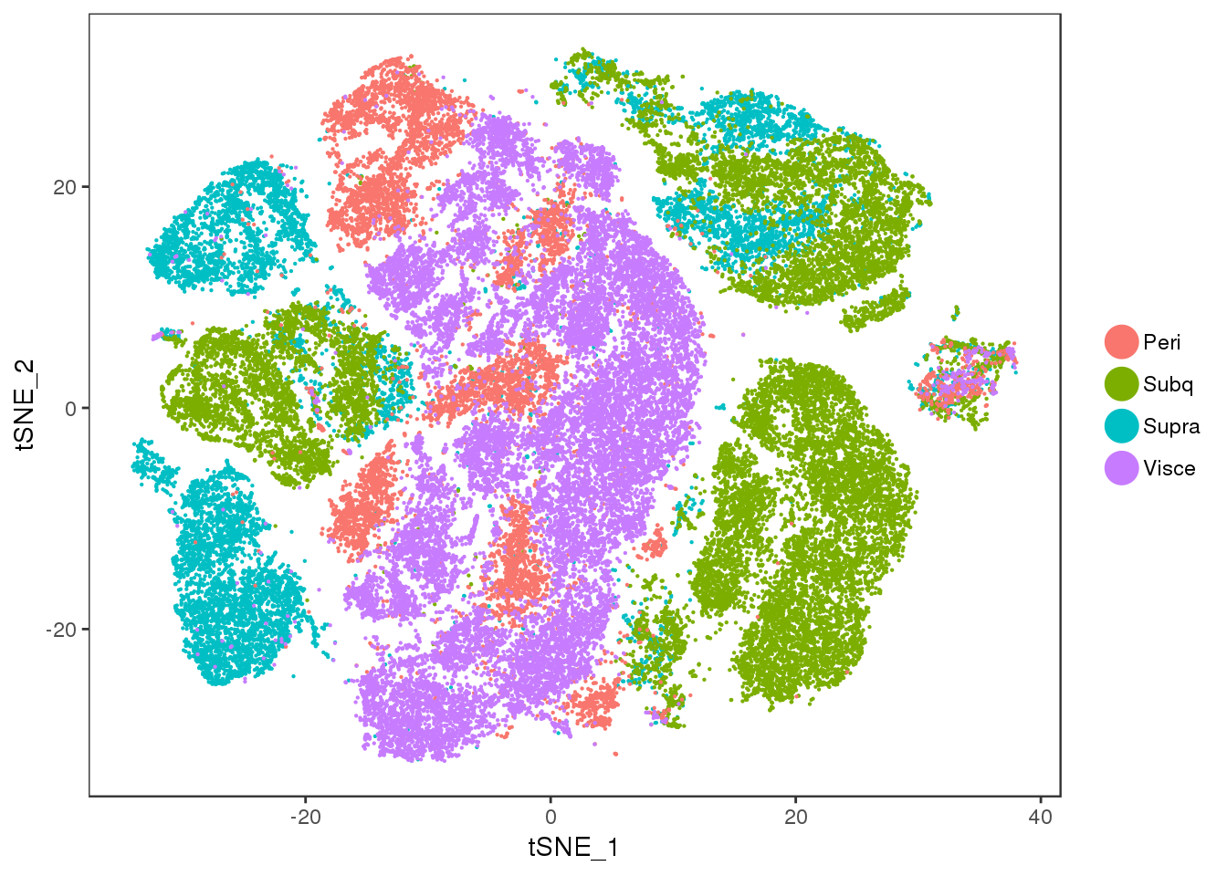 tSNE plots of samples within their depot. Peri2 and Peri3 seem to overlap really well, as well as Supra1 and Supra2, and Visce1 and Visce3.