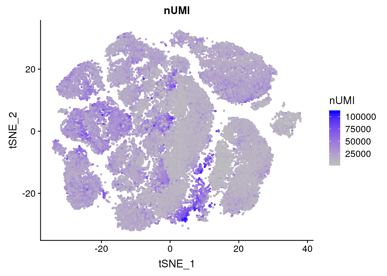 FeaturePlot(all10x, c("nUMI"), cols.use = c("grey","blue"), no.legend=F)