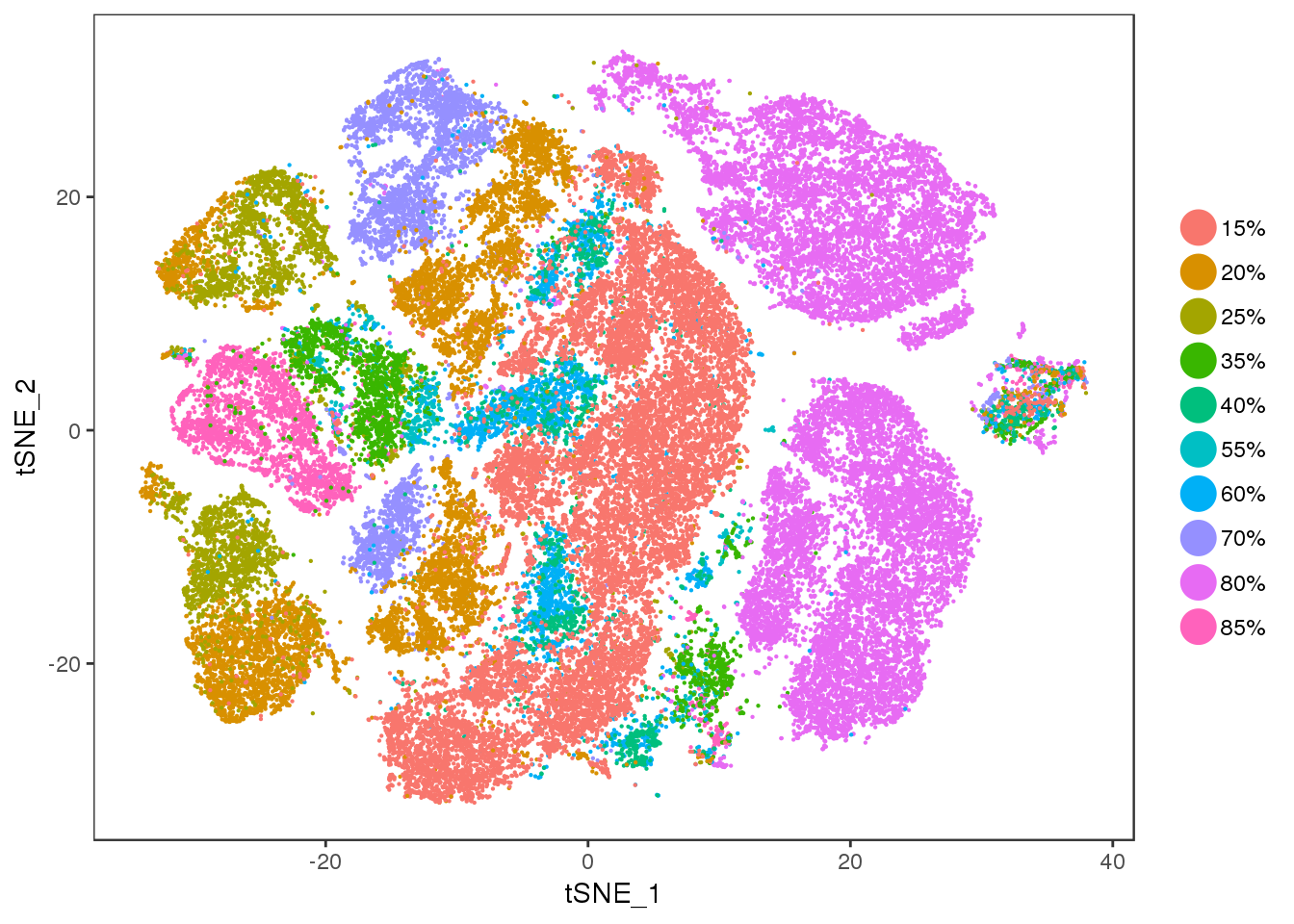 Below are several tSNE plots of the 10x-180504 data. tSNE was performed on the first 15 principal components of the log-normalized scaled (nUMI and percent.mito regressed out) data.