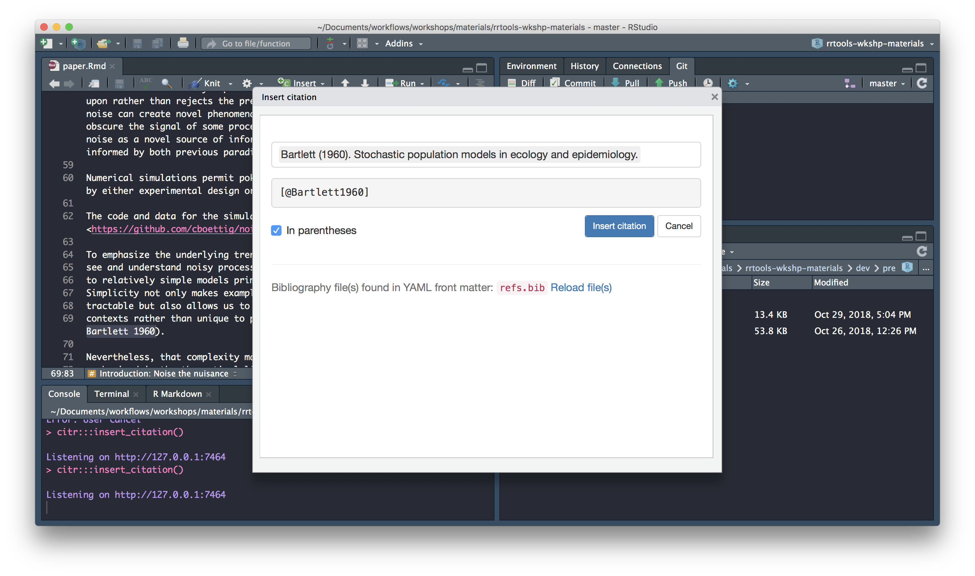 We’ll use the citr package, which provides functions and an RStudio addin to search a BibTeX-file to create and insert formatted Markdown citations into the current document.