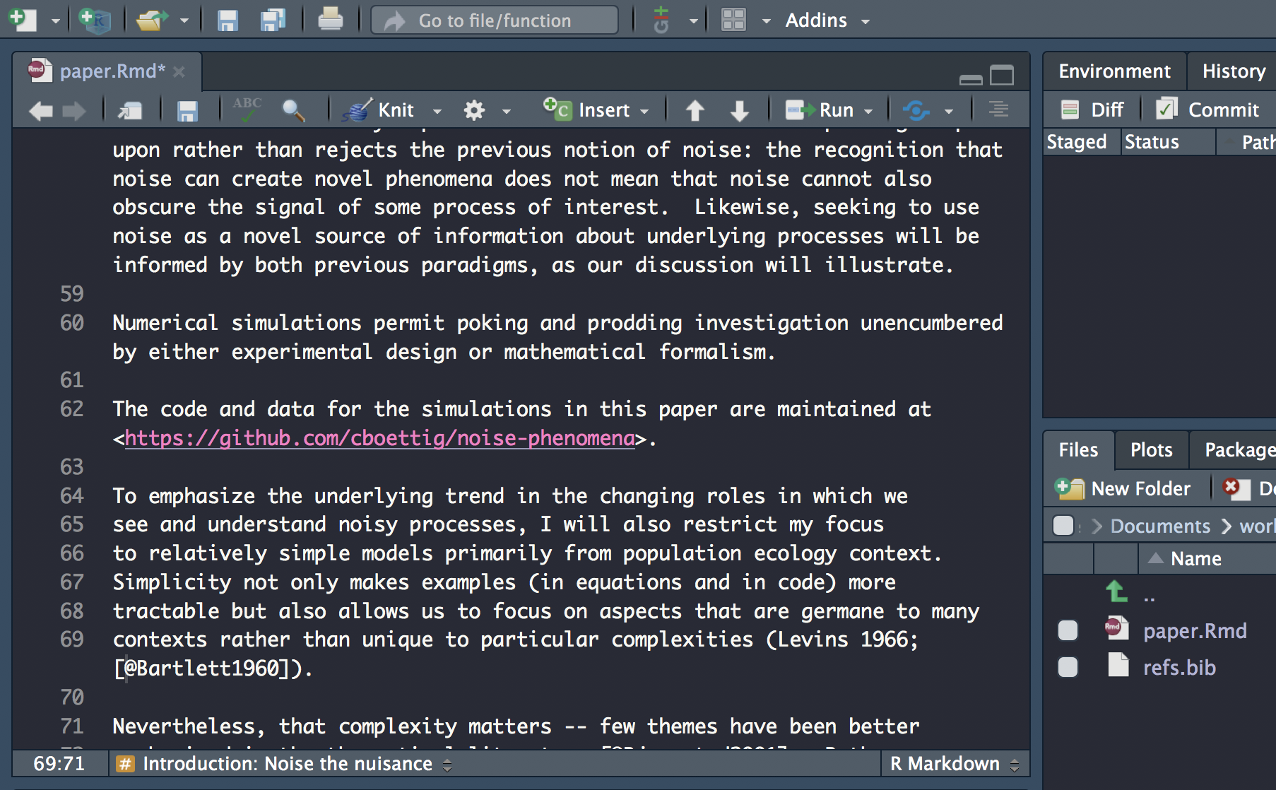In particular, we’re going to combine the code in analysis.R, the text in paper.txt and the references in the refs.bib file in an .Rmd document to reproduce paper.pdf.
