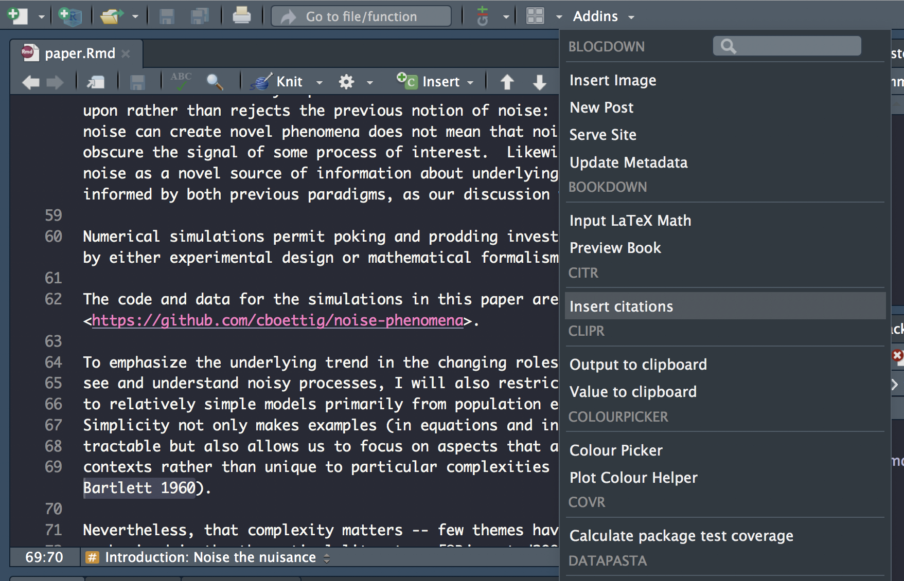 We’ll use the citr package, which provides functions and an RStudio addin to search a BibTeX-file to create and insert formatted Markdown citations into the current document.