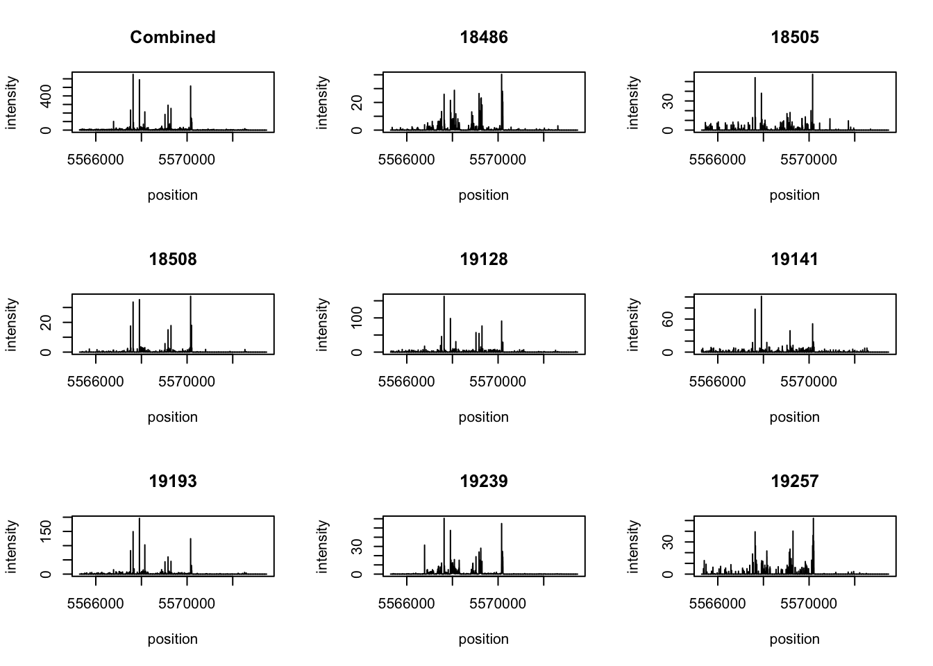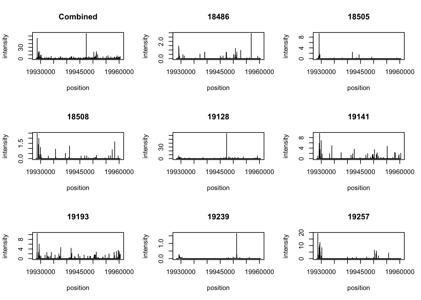 plot(comtregion,comt_res$est,type='l',xlab="position",ylab="intensity", main="Combined")