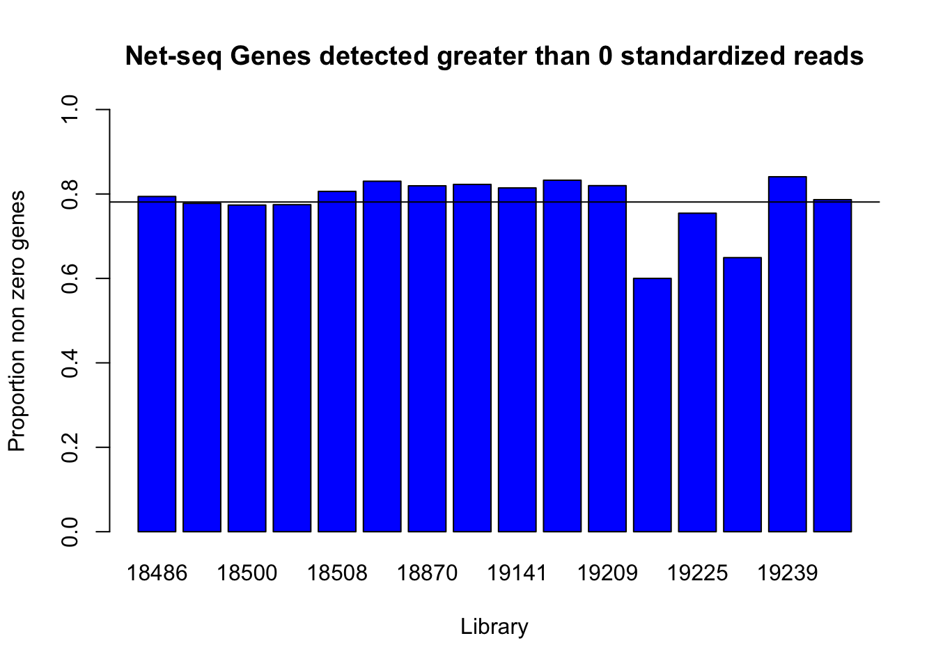 barplot(detected_genes0, ylim = c(0,1), main="Net-seq Genes detected greater than 0 standardized reads", ylab="Proportion non zero genes", xlab="Library", col = 'Blue')