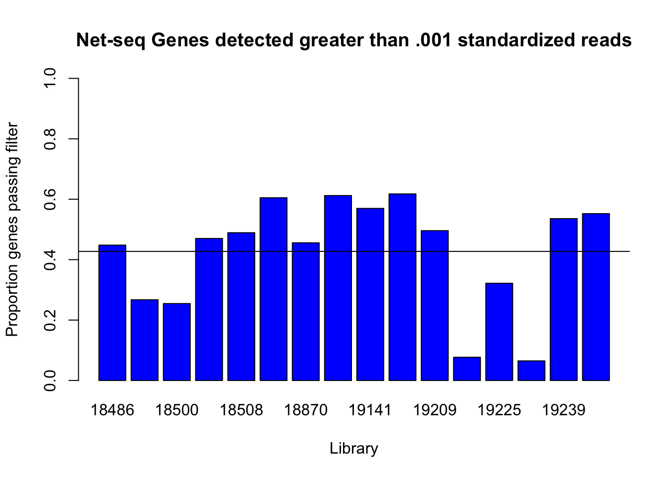 barplot(detected_genes_cut, ylim = c(0,1), main="Net-seq Genes detected greater than .001 standardized reads", ylab="Proportion genes passing filter", xlab="Library", col = 'Blue')