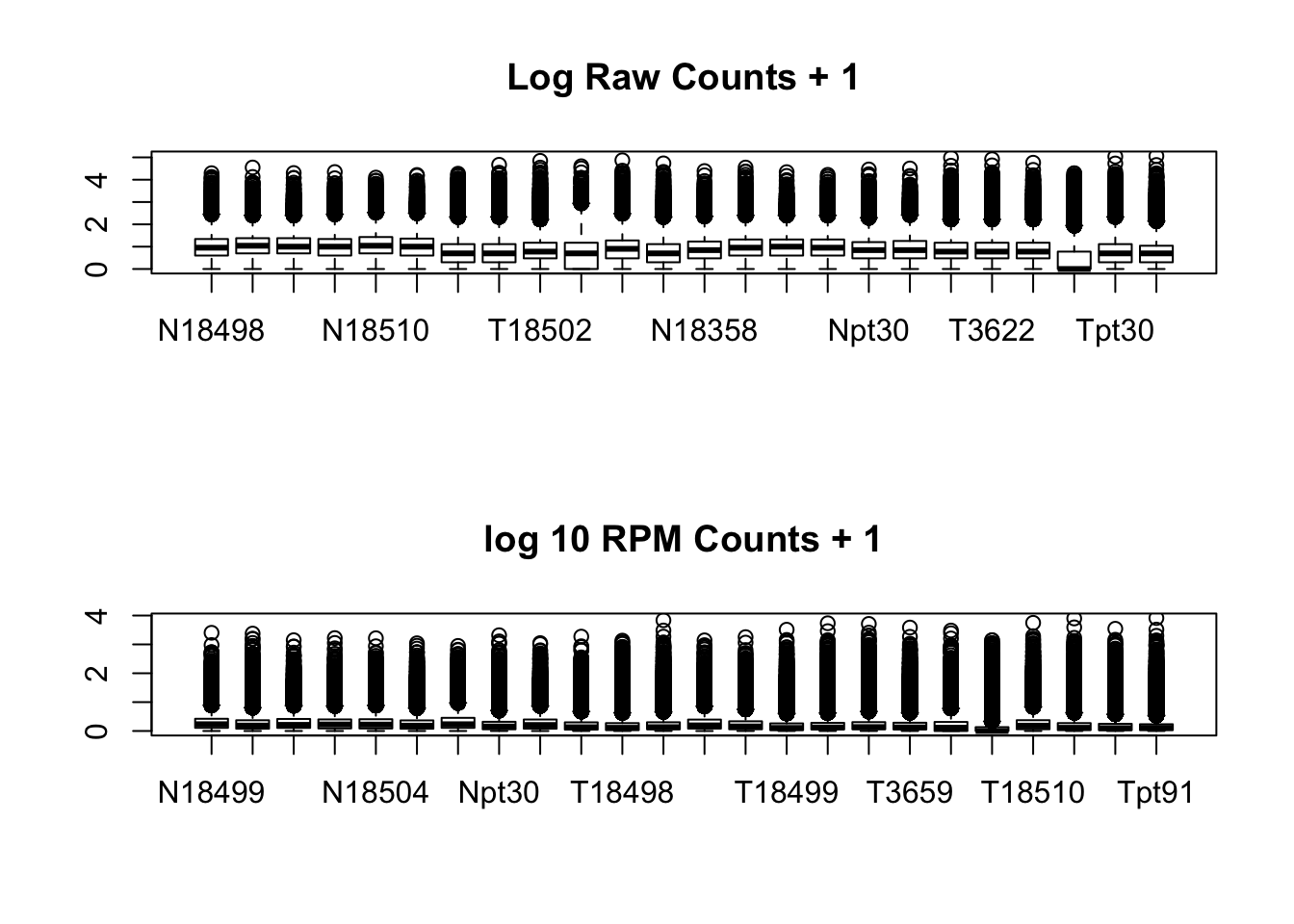 boxplot(log10(allPeakQuant_matrix_rpm + 1), main="log 10 RPM Counts + 1")