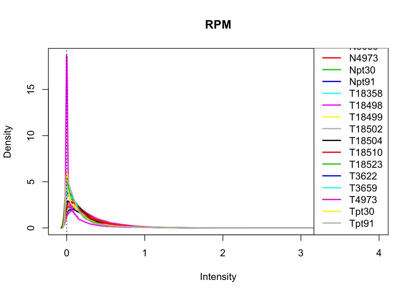 plotDensities(log10(allPeakQuant_matrix_rpm+1), legend = "bottomright", main="RPM")