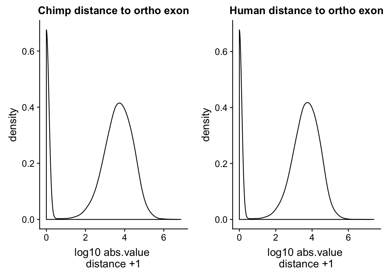 hu=ggplot(human_dist, aes(x=logdis)) + geom_density()+ labs(x="log10 abs.value \n distance +1 ", title="Human distance to ortho exon")