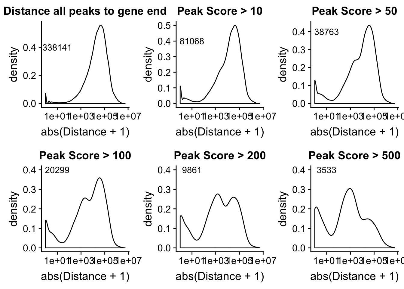 allPeakplot=ggplot(peak2transDist_noties, aes(x=abs(Distance + 1)))+ geom_density() + scale_x_log10() + labs(title="Distance all peaks to gene end") + annotate("text", label=nrow(peak2transDist_noties), x=10, y=.4)