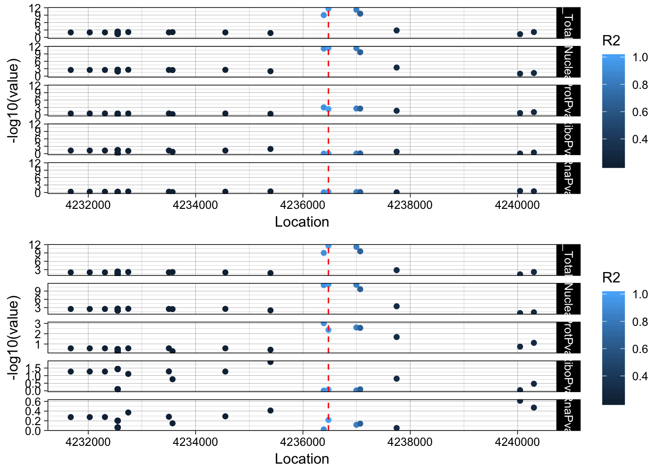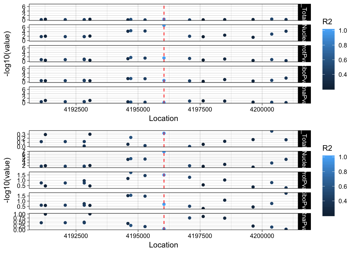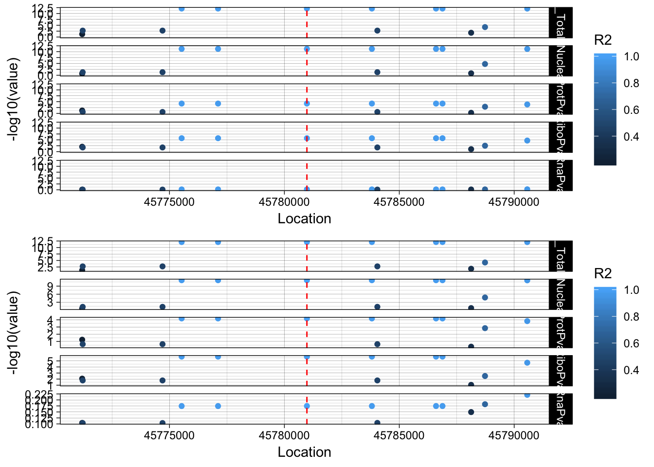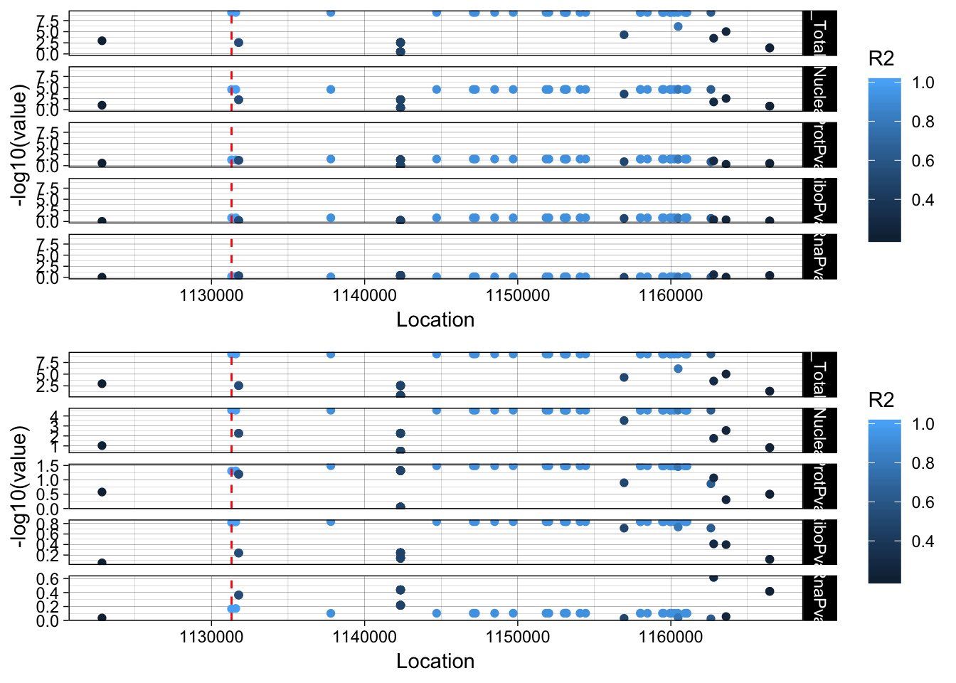 ribo_SACM1L_LZ=read.table("../data/LocusZoom/Ribo.SACM1L.nomTotal.txt", stringsAsFactors = F, col.names = c("PeakID", "SNP", "Dist", "P","slope"))  %>% select( SNP, P)