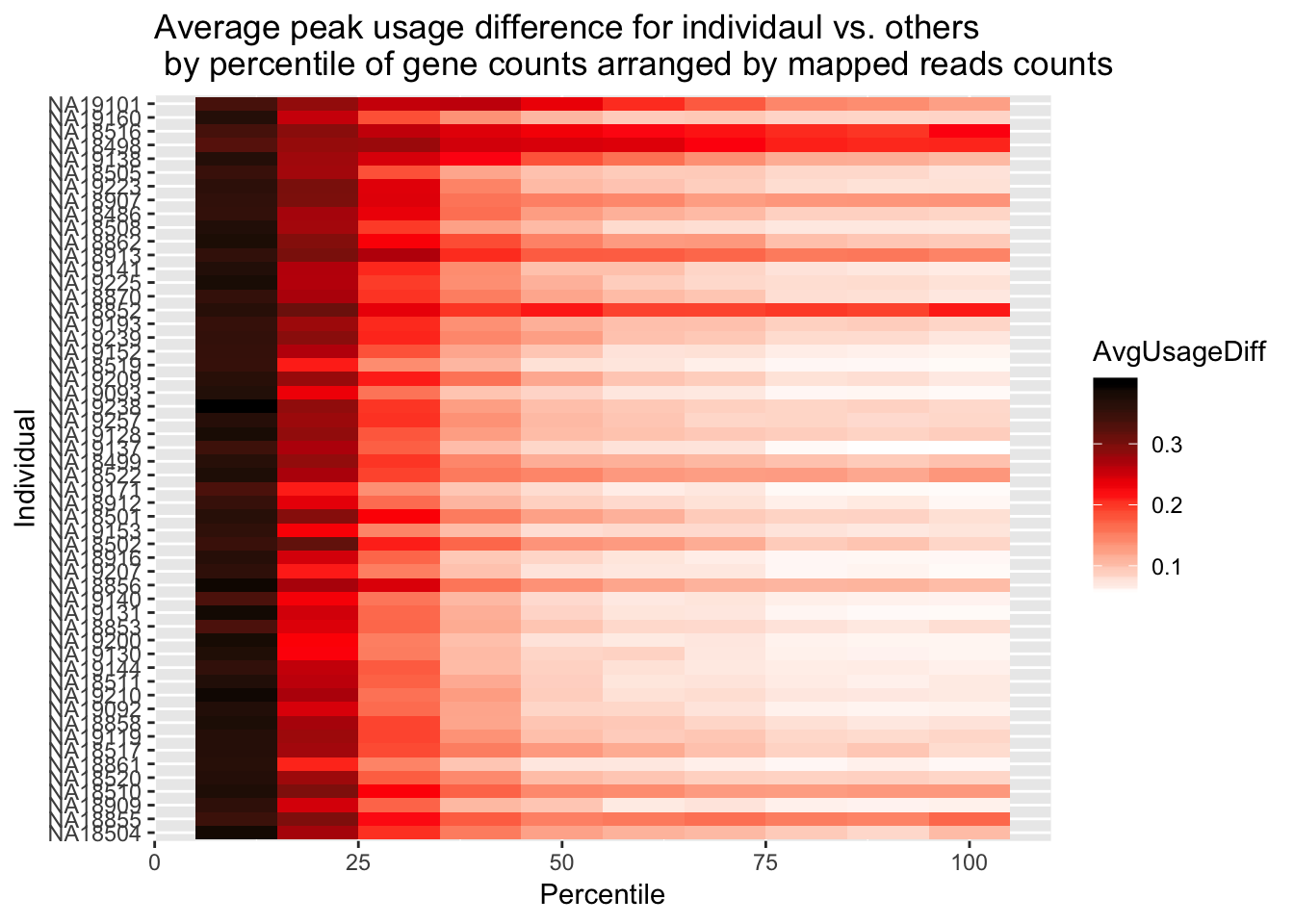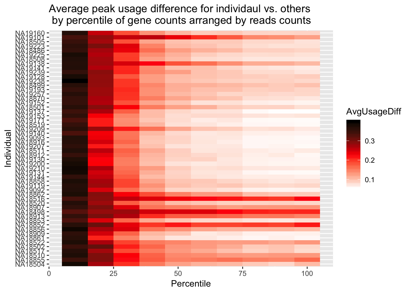 ggplot(Percentile_melt2, aes(x=Percentile, y=Individual, fill=AvgUsageDiff)) + geom_tile() + labs(title="Average peak usage difference for individaul vs. others \n by percentile of gene counts arranged by mapped reads counts") + scale_fill_gradientn(colours = c("white", "red", "black"))