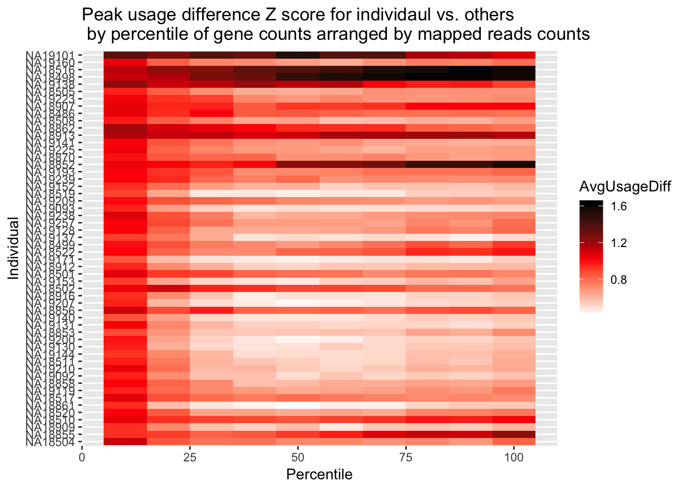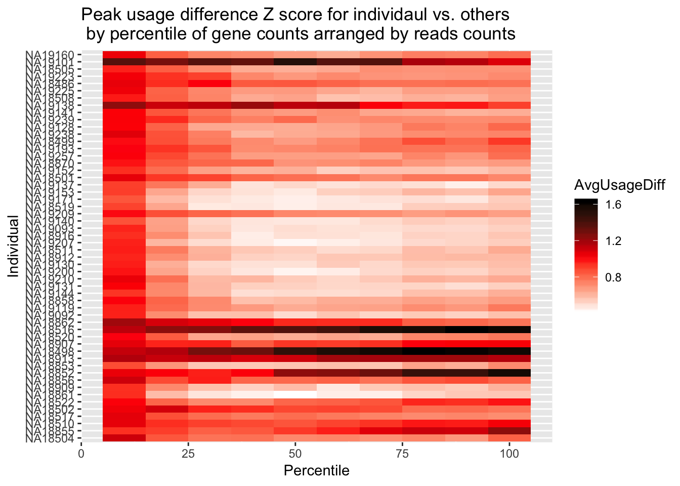 ggplot(Percentile_z_melt2, aes(x=Percentile, y=Individual, fill=AvgUsageDiff)) + geom_tile() + labs(title="Peak usage difference Z score for individaul vs. others \n by percentile of gene counts arranged by mapped reads counts") + scale_fill_gradientn(colours = c("white", "red", "black"))