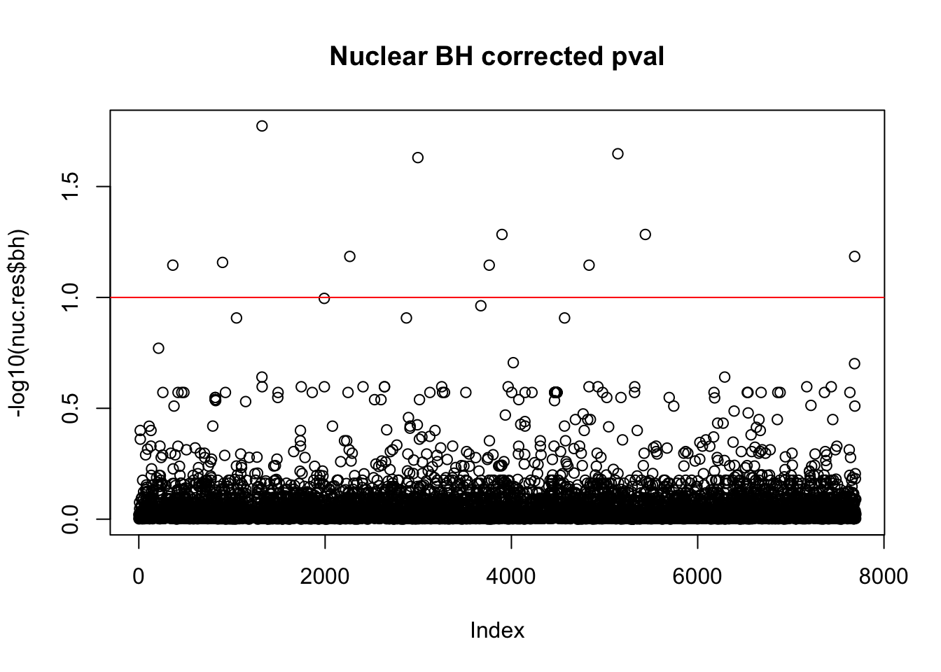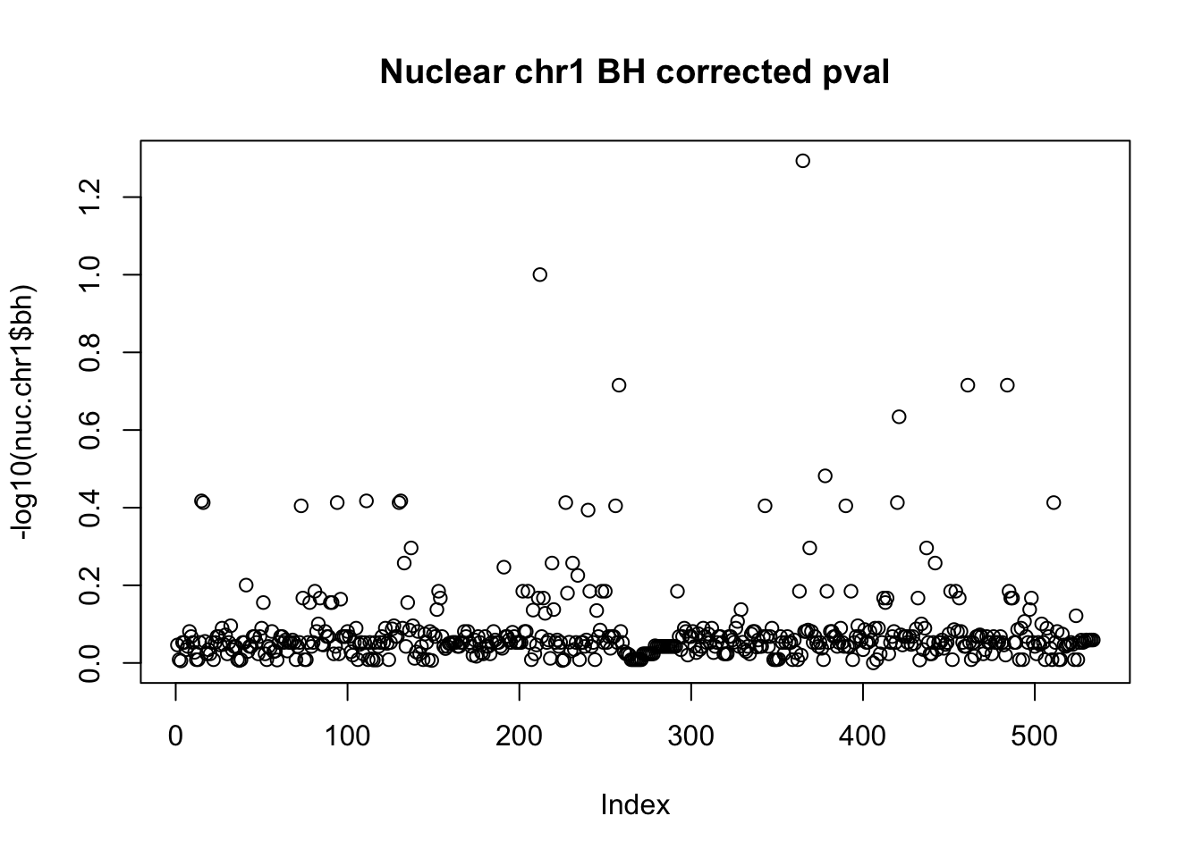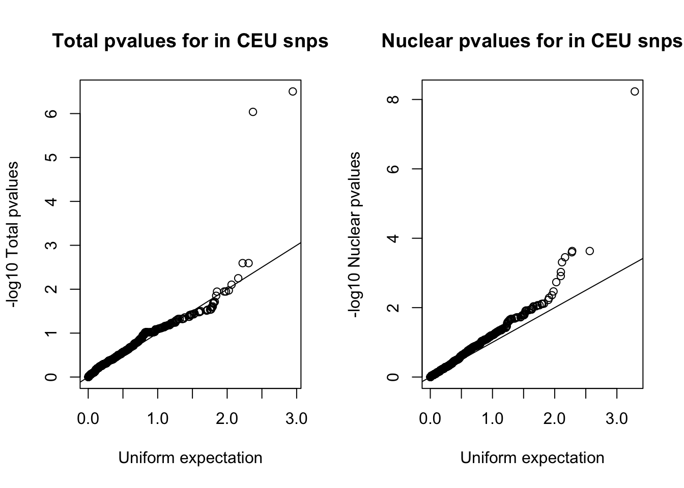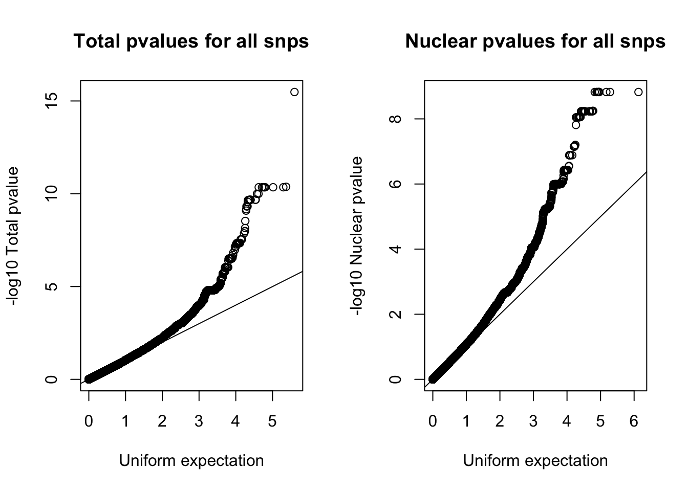nuc_QTL= nuc.res %>% filter(bh< .15)tot.res = tot.res %>% mutate(QTL=ifelse(bh<.15, "Yes", "No") )