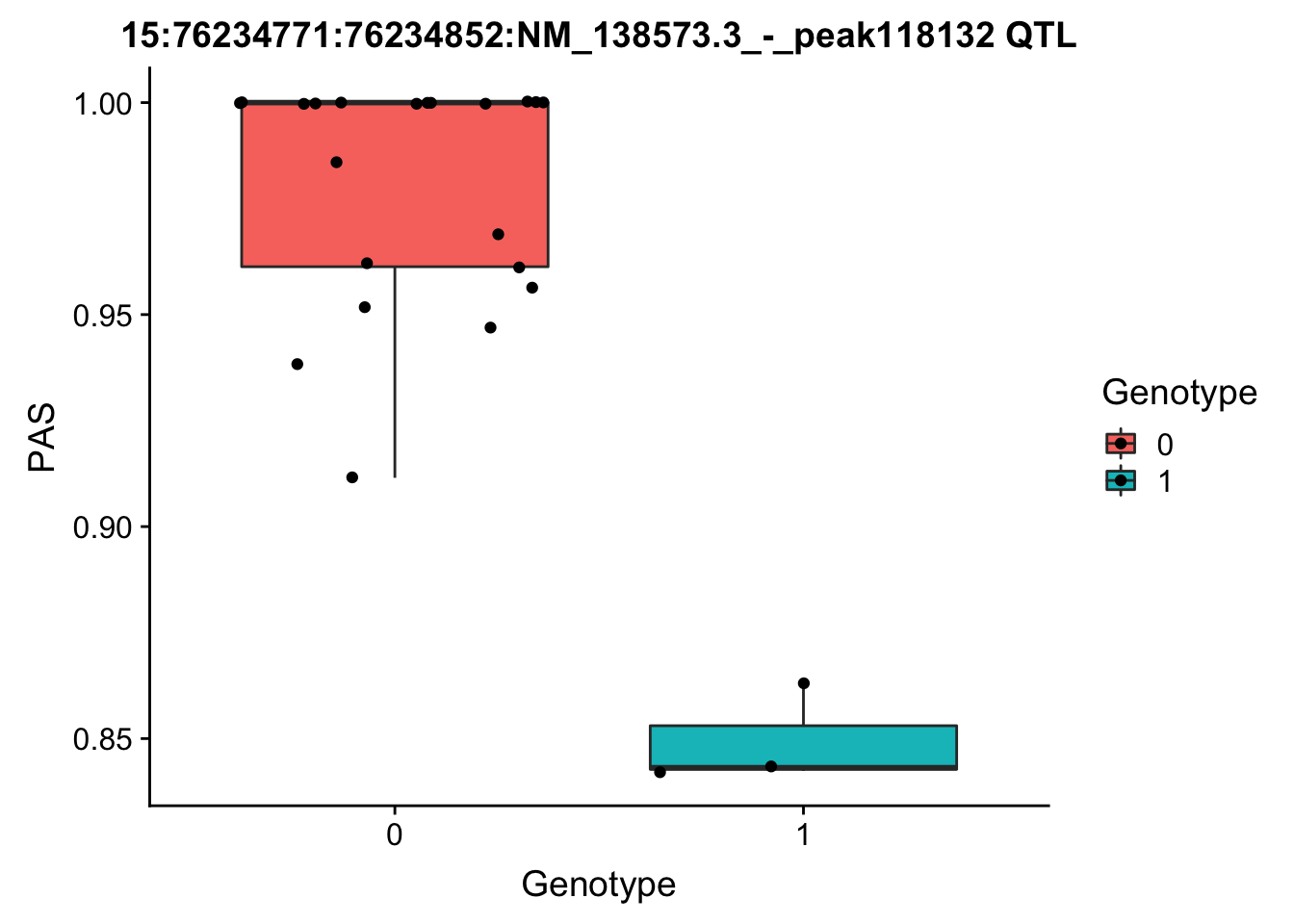 ggplot(for_plot, aes(x=Genotype, y=PAS, fill=Genotype, group=Genotype)) + geom_boxplot() + labs(x="Genotype", title="15:76234771:76234852:NM_138573.3_-_peak118132 QTL") + geom_jitter( aes(x=Genotype, y=PAS))