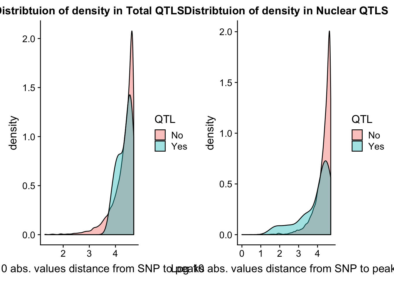 nuc.dist=ggplot(nuc.res, aes(x=log10(abs(dist)+1), group=QTL, fill=QTL)) + geom_density(alpha=.4) + labs(title="Distribtuion of density in Nuclear QTLS",x="Log 10 abs. values distance from SNP to peaks")