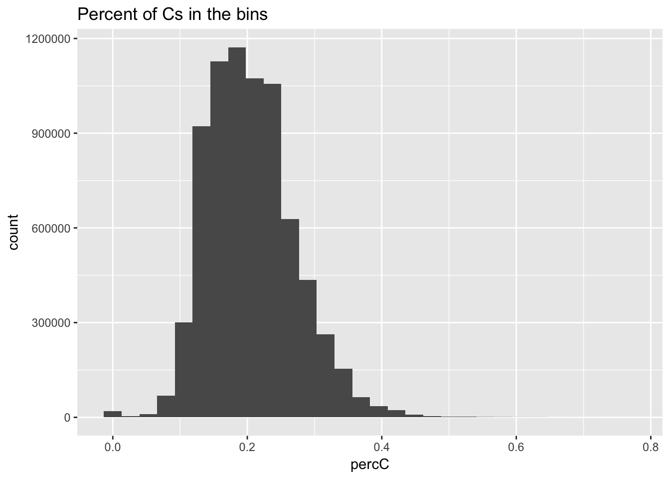 perc_C_bin=bin_nuccov %>% select("chr", "start", "end","bin", "strand", "gene", "numC") %>% mutate(percC=numC/200)