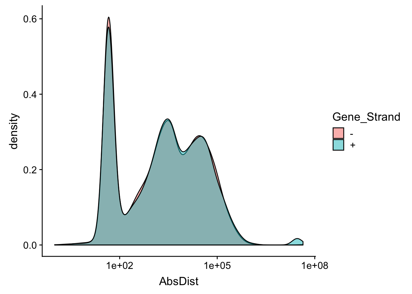 ggplot(distTXN2Peak, aes(x=AbsDist, by=Gene_Strand, fill=Gene_Strand)) + geom_density(alpha=.5) + scale_x_log10()