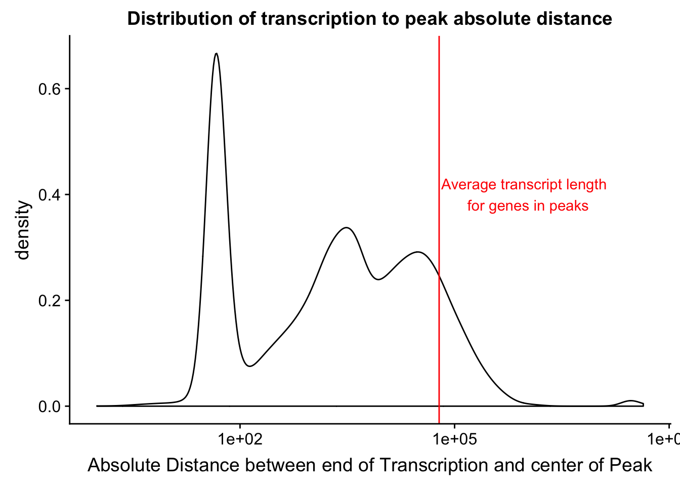 distTXN2PeakPlot=distTXN2PeakPlot+  geom_vline(xintercept=mean(txnanno$length), col="red") + annotate("text", x=1000000, y=.4, label="Average transcript length \n for genes in peaks", col='red')