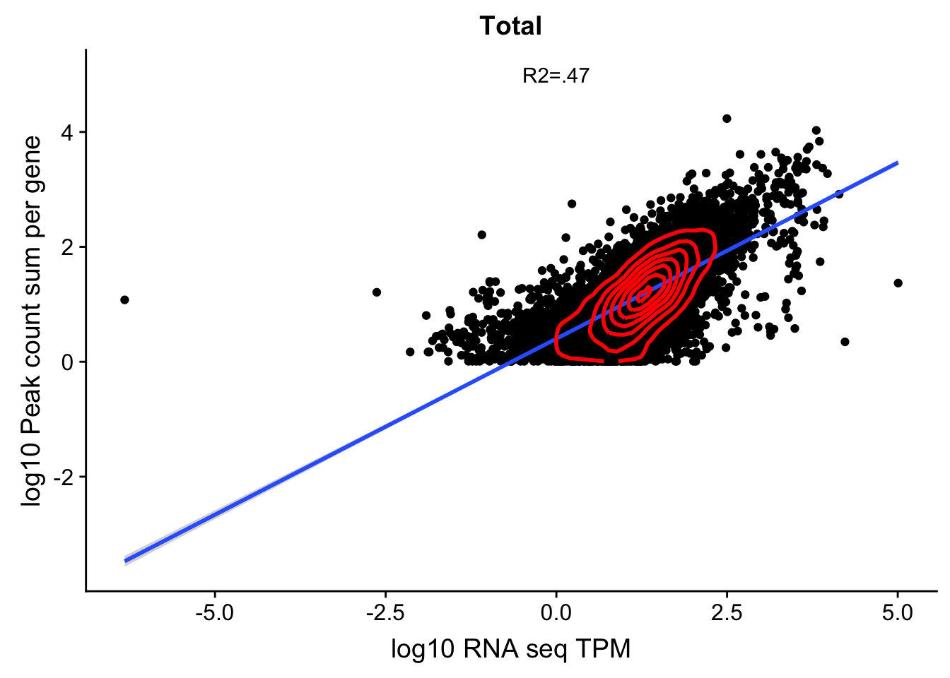corr_18486Tot=ggplot(TXN_Gene, aes(x=log10(TPM), y= log10(GeneSumNorm))) + geom_point() + labs(title="Total", x="log10 RNA seq TPM", y="log10 Peak count sum per gene")+ geom_smooth(aes(x=log10(TPM),y=log10(GeneSumNorm)),method = "lm") + annotate("text",x=0, y=5,label="R2=.47") +geom_density2d(na.rm = TRUE, size = 1, colour = 'red')