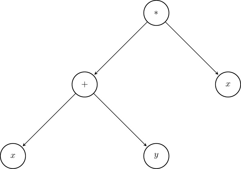 What follows is a helper function that builds the expression tree for our toy function $f(x,y)=(x+y)x$. This looks a bit clumsy right now but we'll improve the syntax as we go.