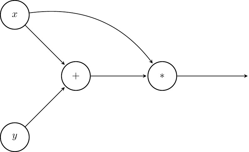Notice that we now have a tree like structure. Our root node is the final operation to be executed to receive the result of $f(x,y)$. $x$ shows up twice now. Finding the value of an expression tree requires to compute values of nodes in lower layers first and bubble information up towards the root node. Backpropagation on the other hand can start at the root and then follow the forward edges. When computing derivatives not much changes: we will have a summation over all paths from the top that lead to a given node and every node will perform the product of two terms (chain rule) that is send to its children.
