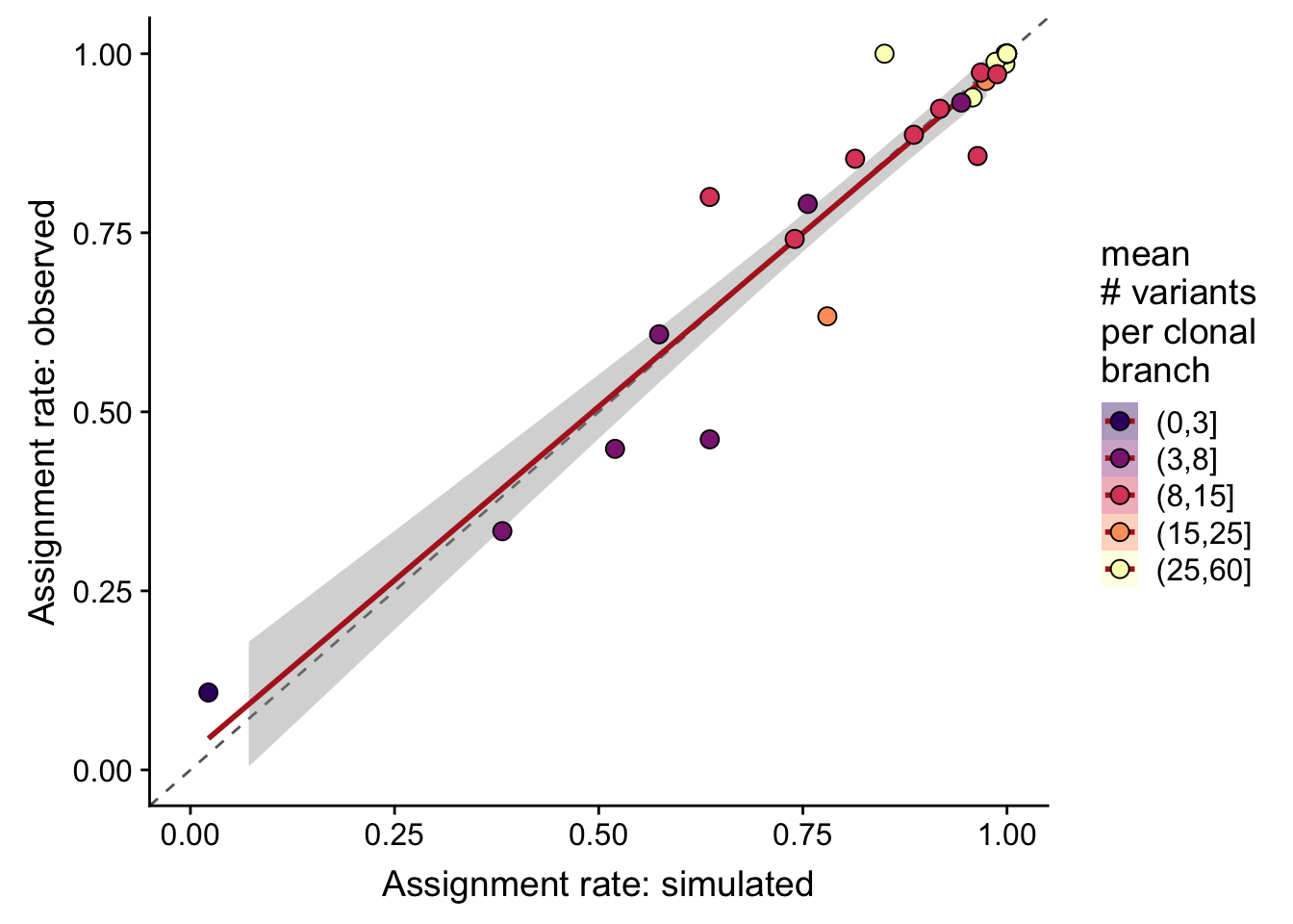 Overall correlation in assignment rates (recall) from simulated and observed data is 0.959.