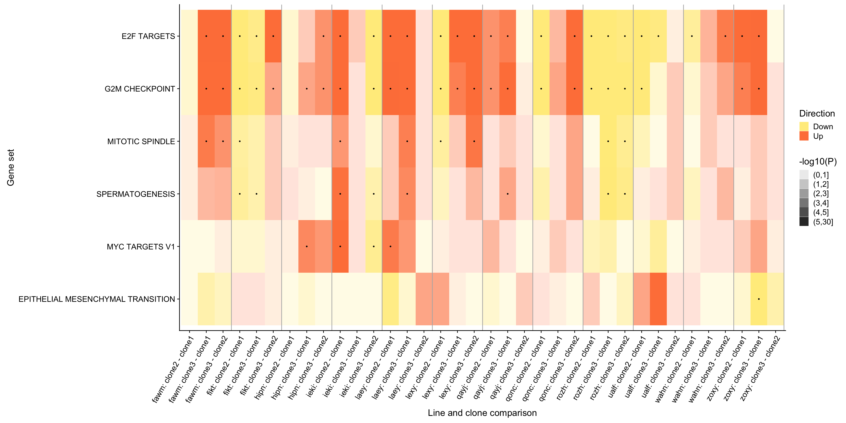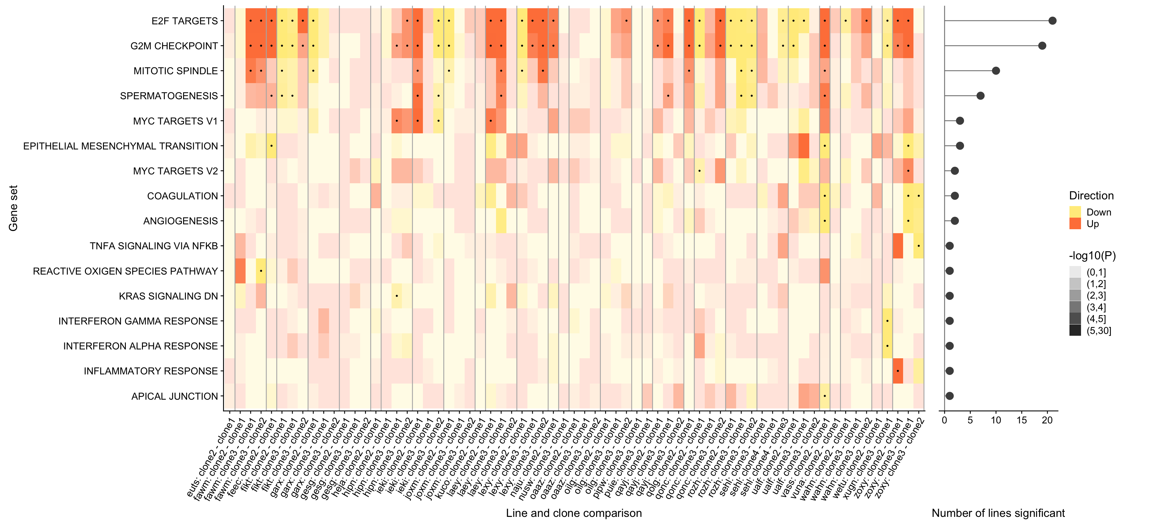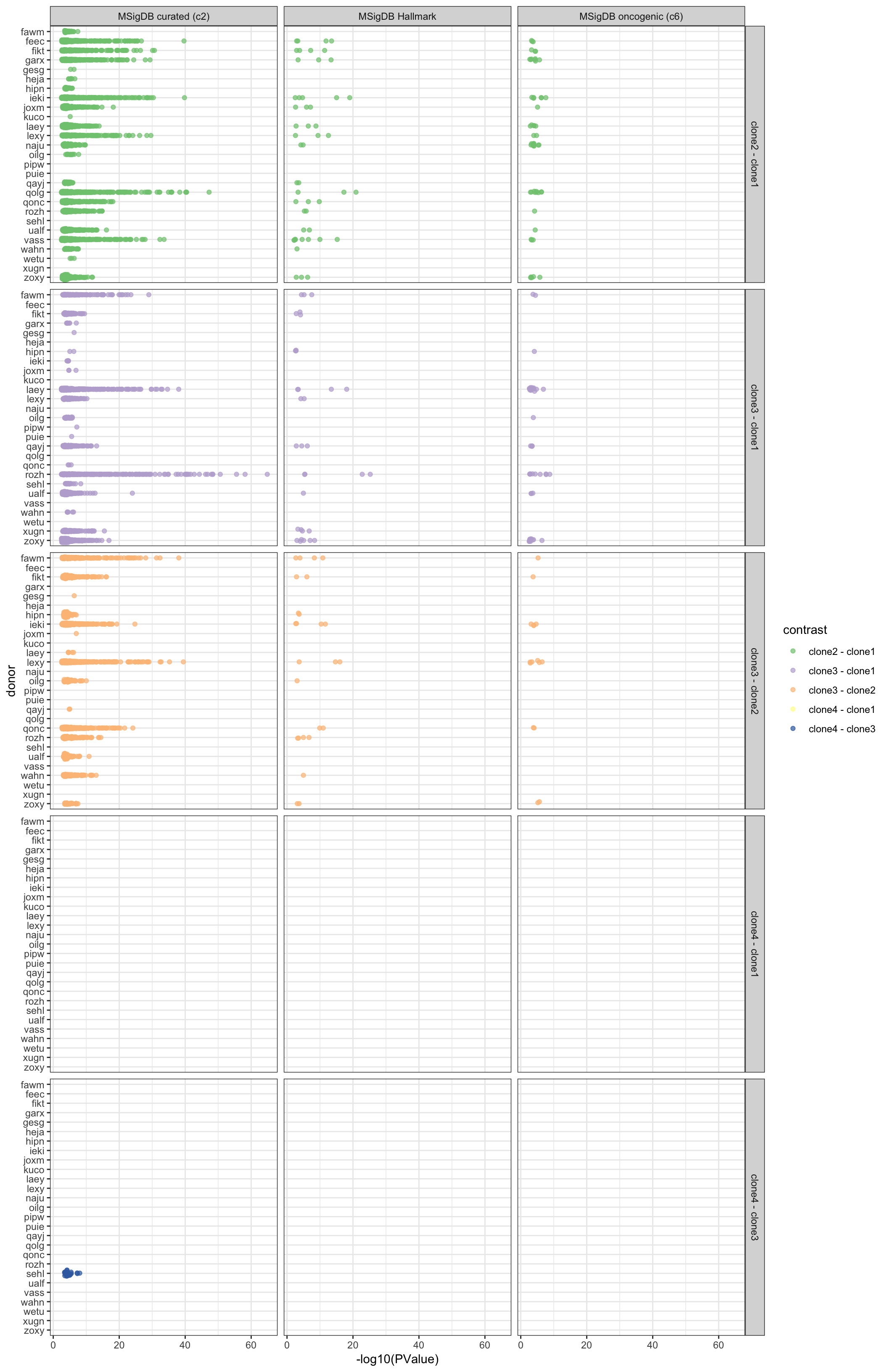 Here, we will lok at differential expresion between clones across all lines ( i.e. donors) at the gene and gene set levels.