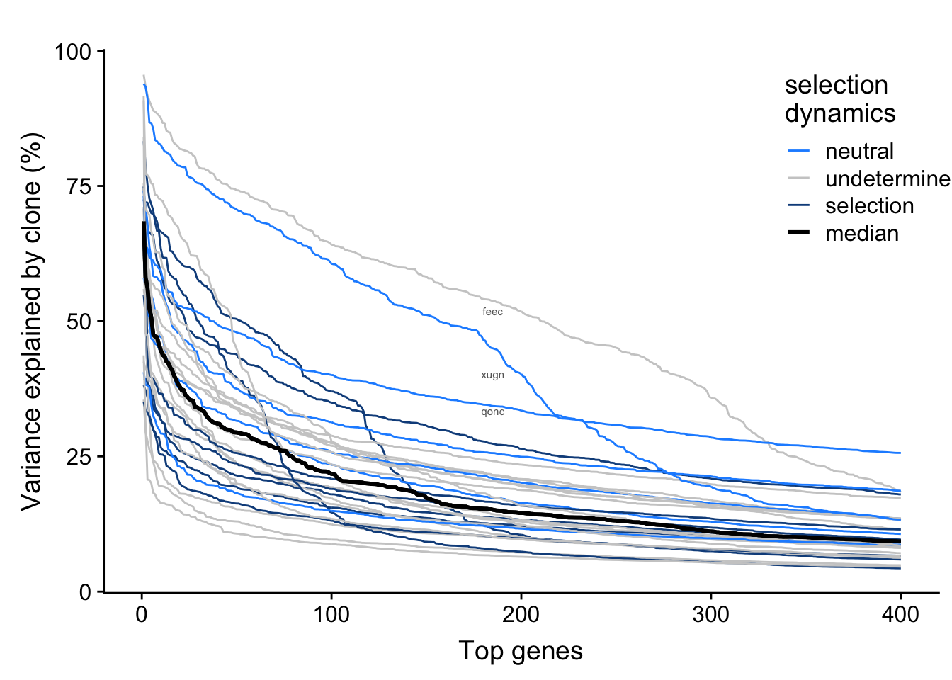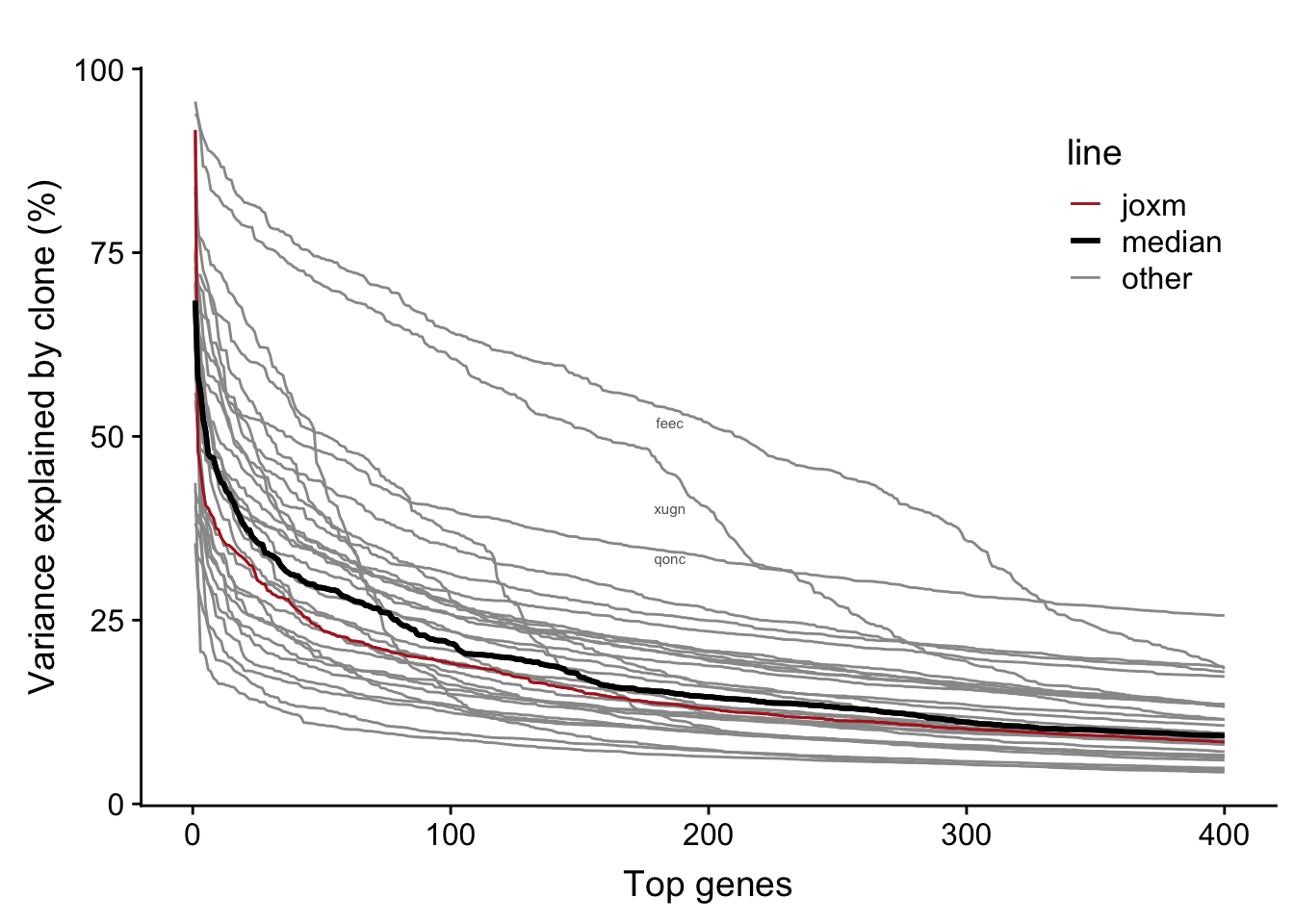 We detect 194 genes with more than 5% of variance explained by clone and 1034 genes for which variance explained by clone is both greater than 1% and also greater than the variance explained by plate (a good proxy for technical effects on variability in gene expression between cells).