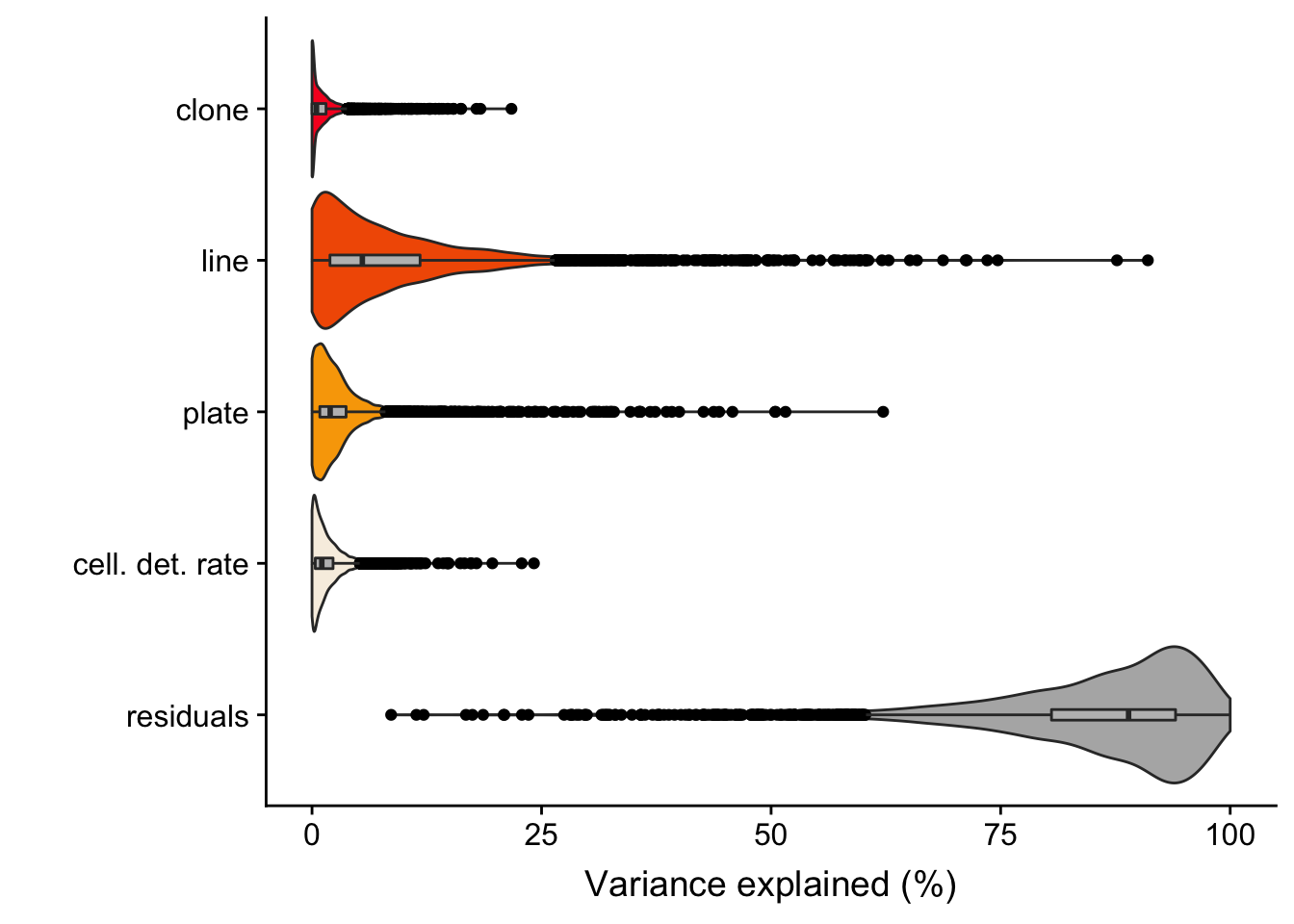 recursive = TRUE)Previously, we conducted variance components analysis combining scRNA-seq data across all lines. We used the variancePartion package, fitting assigned clone, line, plate (on which cells were processed) and cellular detection rate (cdr; proportion of genes per cell with non-zero expression) as random effects.