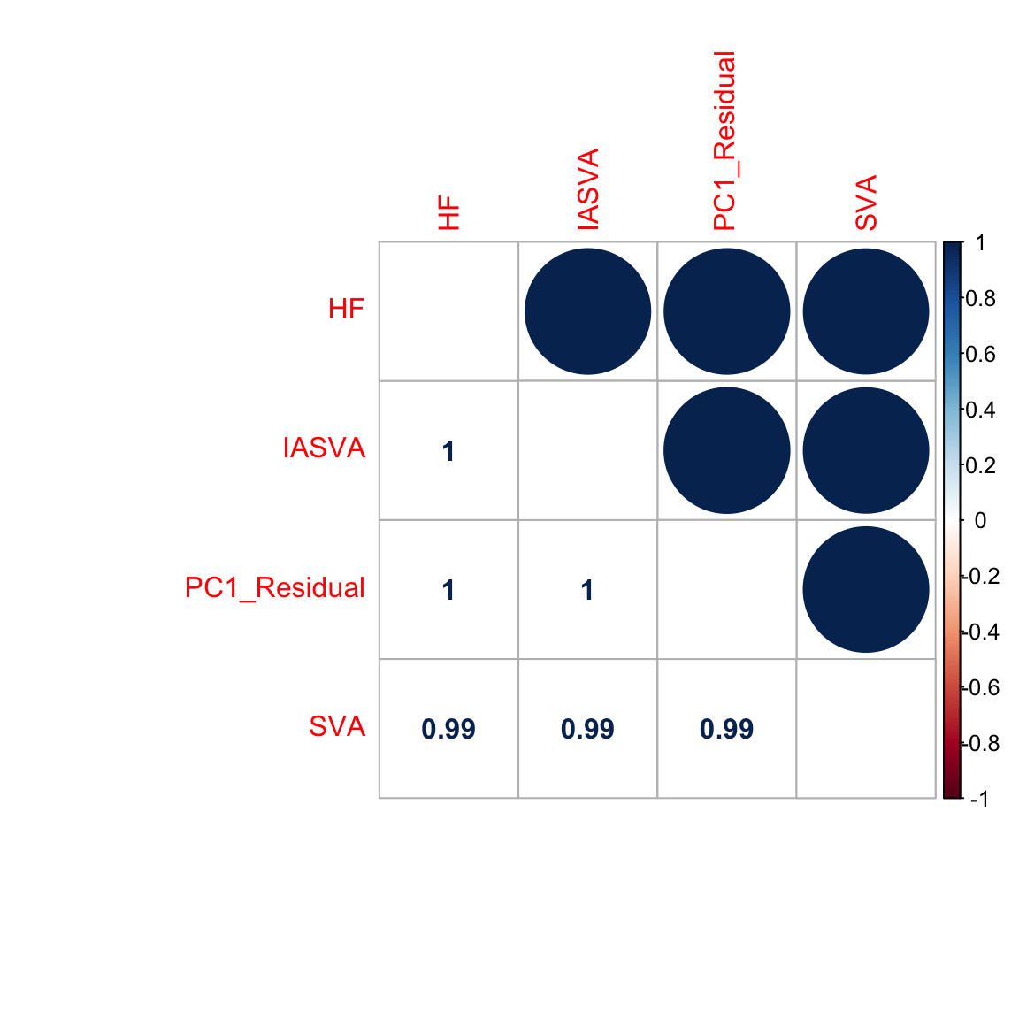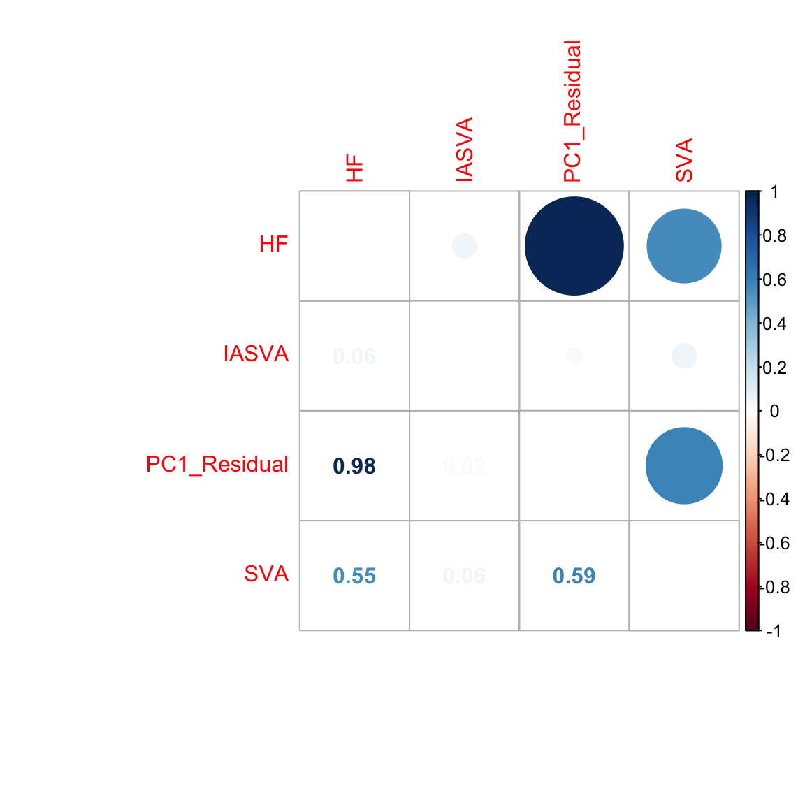 colnames(hf.mat) <- c("HF", "IASVA","PC1_Residual","SVA")